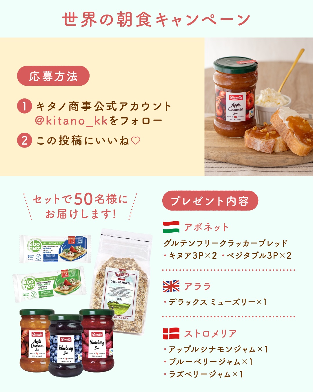 キタノ商事株式会社(本社:大阪府大阪市、代表取締役社長:木村谷和宏)は、2026年4月23日(木)より、キタノ商事株式会社公式インスタグラム @kitano_kk にて、世界のおいしさを厳選した輸入食品で朝を楽しむ「世界の朝食キャンペーン」を開催いたします。