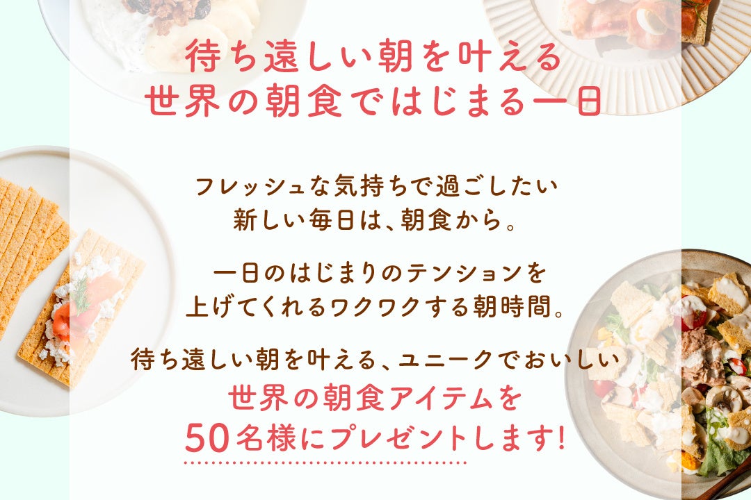 新しいシーズンが始まり「朝はフレッシュな気持ちで過ごしたい」そんな方におすすめしたい、一日のはじまりのテンションを上げてくれる、ユニークでおいしい「世界の朝食アイテム」を3ブランドセットにして50名様にプレゼントいたします。