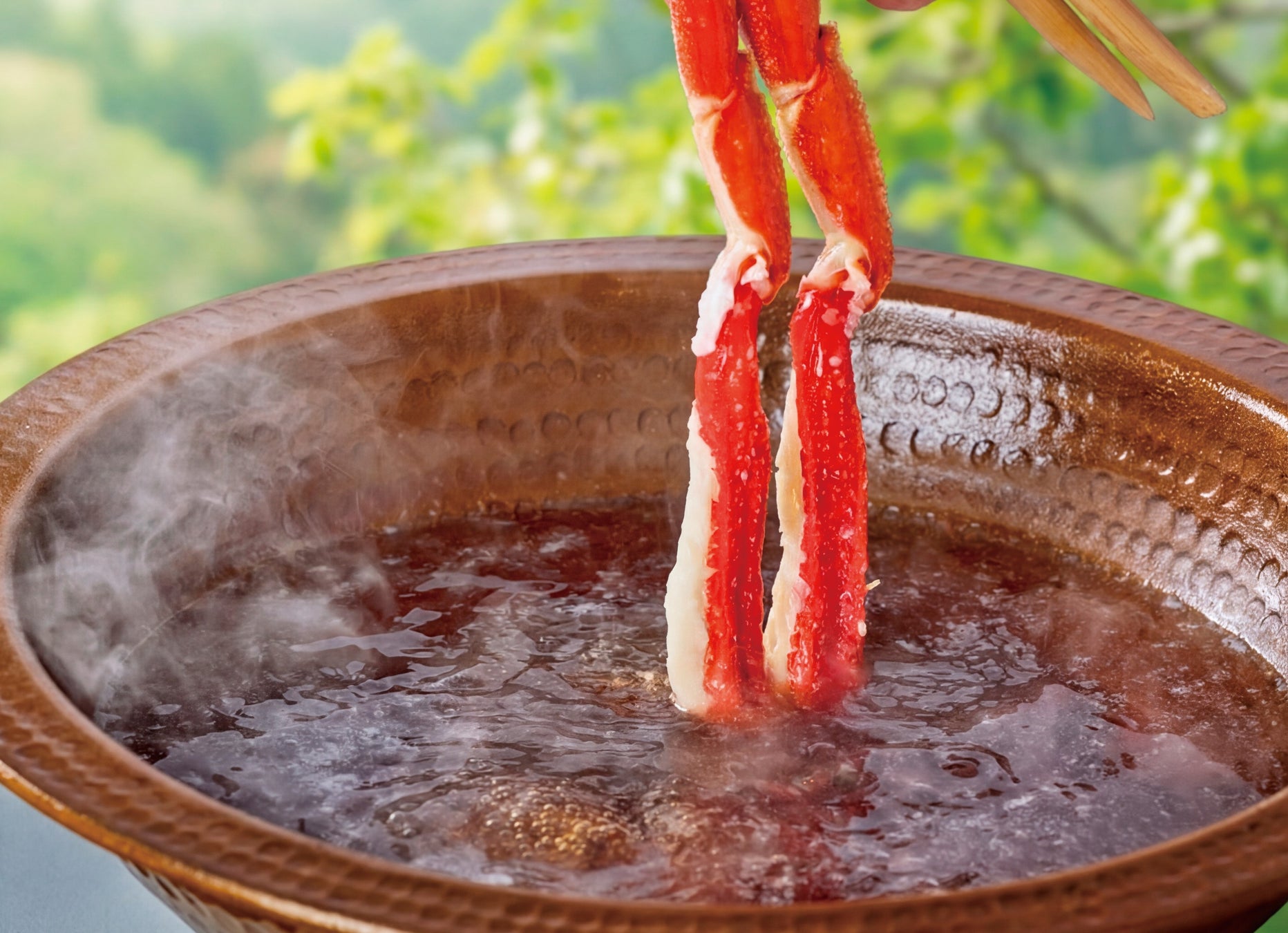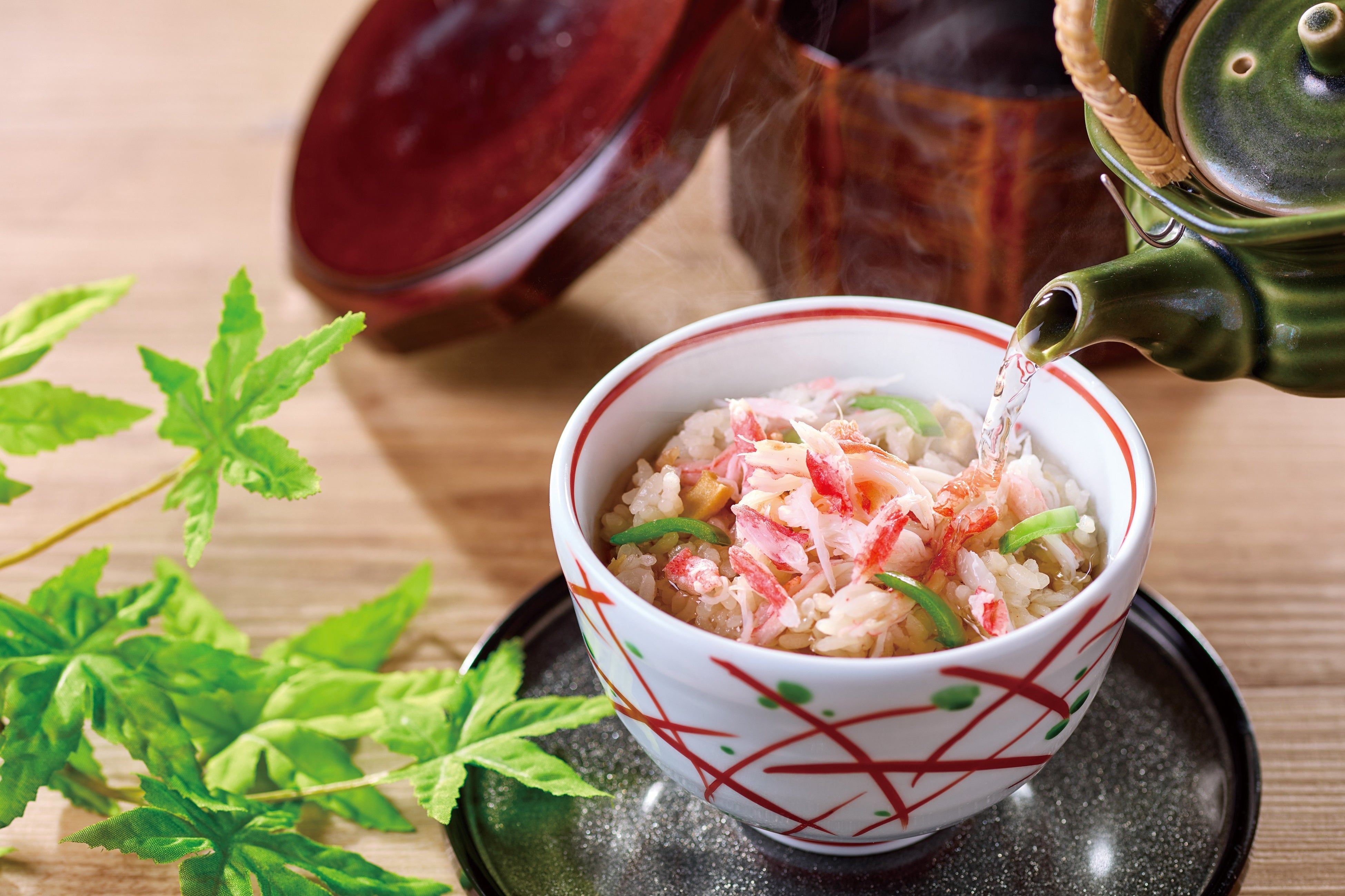 御膳メニューの「新緑(しんりょく)」では、人気のかにしゃぶと釜めしを中心に、刺身やフライ、茶碗蒸しなど多彩な料理をバランスよく取り揃え、満足感のある一膳に仕立てました。