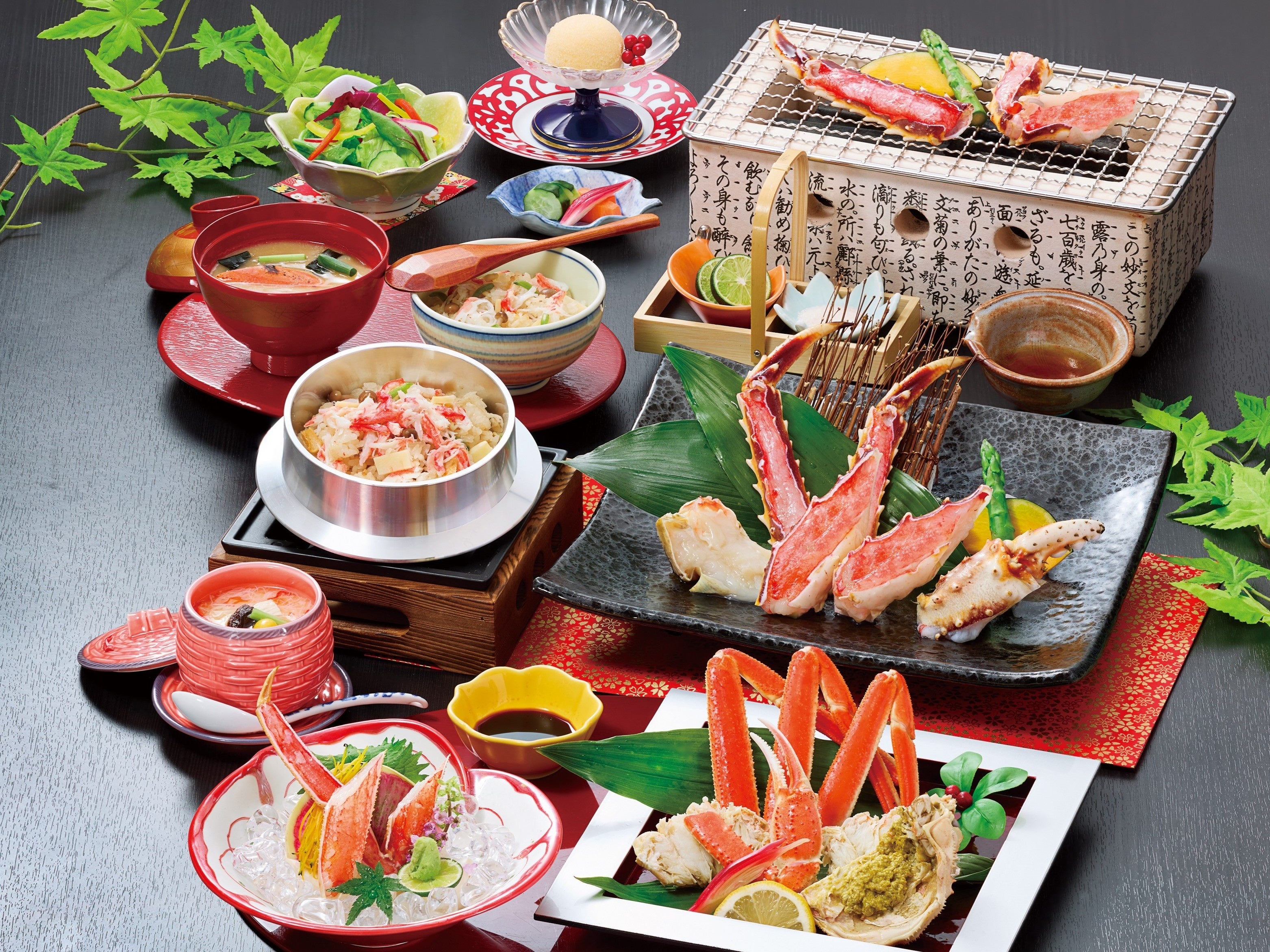 茹でがに半身盛り、たらば炭火焼き、かに刺身、サラダ、かに茶碗蒸し、かに釜めし、お椀、香の物、デザート