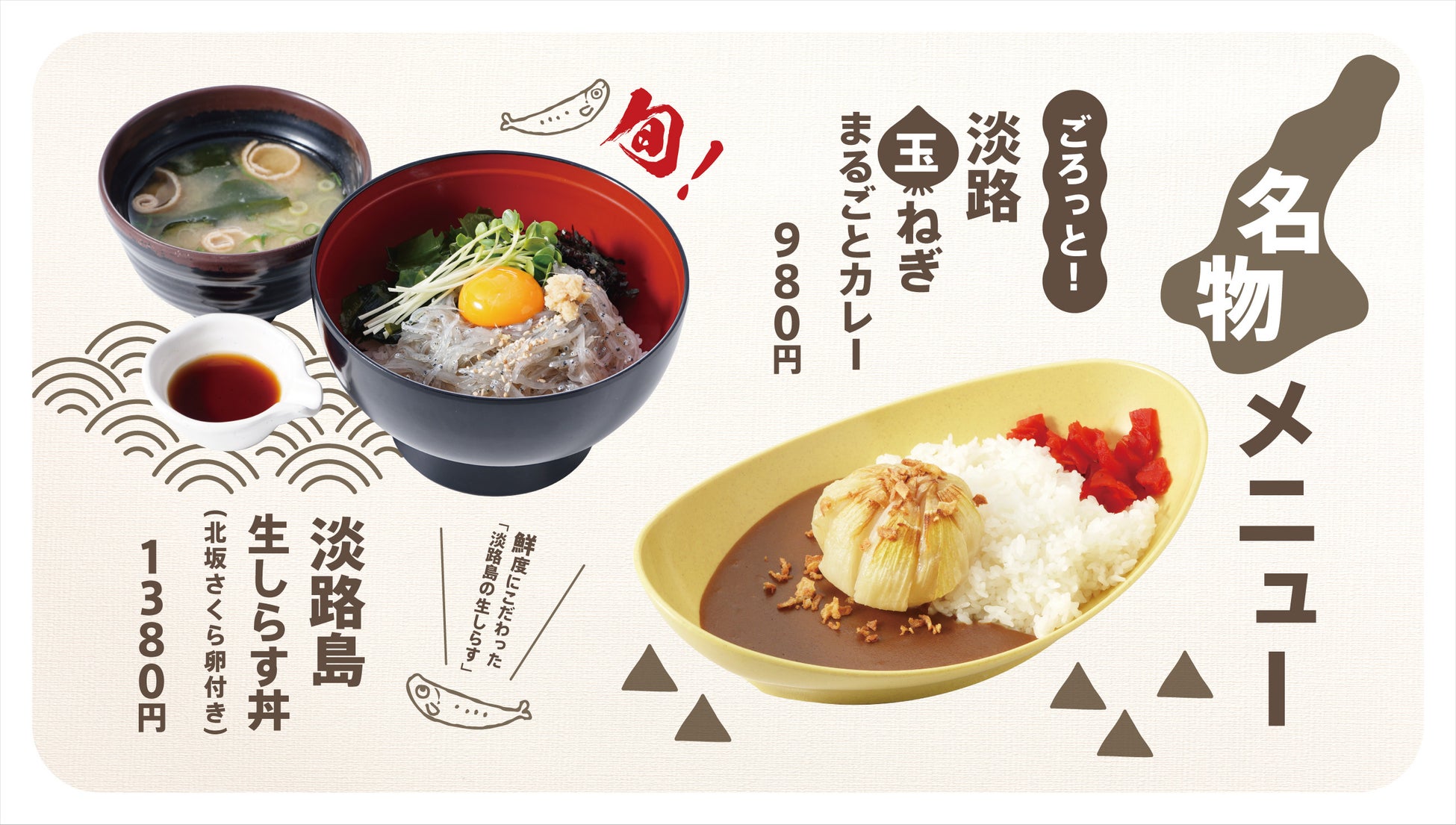 淡路島の春の味覚を代表する“生しらす”をたっぷり盛り付けた、期間限定の特別メニュー「淡路生しらす丼(北坂さくら卵付き)」をご提供いたします。水揚げ後すぐに鮮度管理された淡路島産生しらすは、透明感のある美しい見た目と、とろけるような口当たり、ほんのり甘い旨みが特徴です。さらに、淡路島・北坂養鶏場の「さくら卵」を添えることで、まろやかなコクと濃厚な旨みが加わり、生しらすの繊細な味わいを一層引き立てます。卵黄を絡めてお召し上がりいただくと、まるで“海の恵みをそのまま味わう”ような贅沢な味わいが広がります。