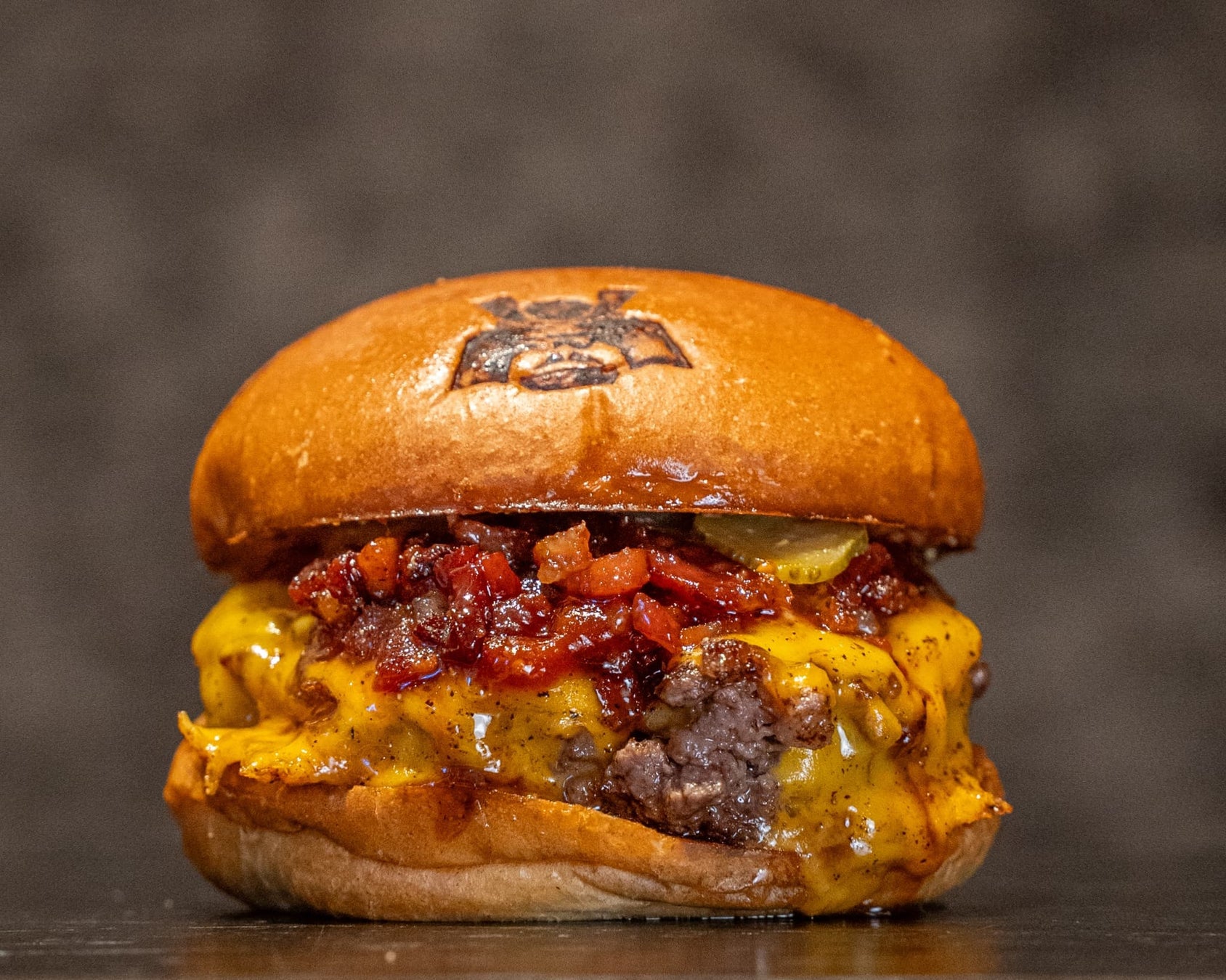 その間には、甘じょっぱいオリジナルのベーコンジャムとピクルスを挟み、