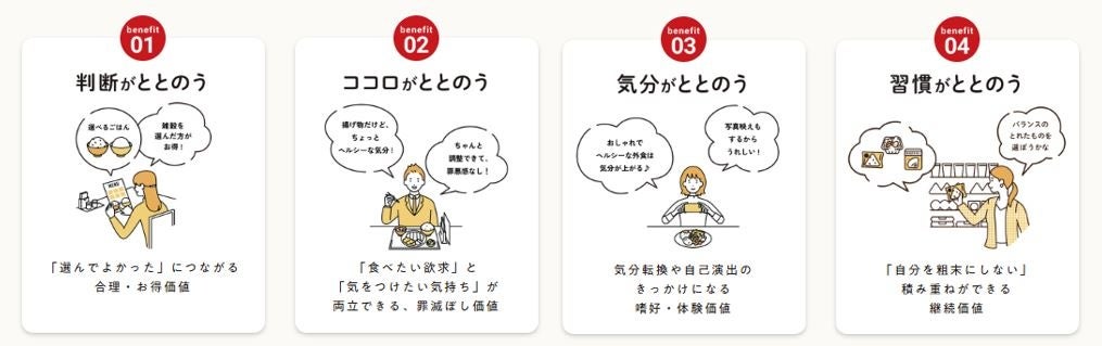 活動開始から5年目となる2026年度は、全国15,000人を対象とした調査結果[i]から、生活者の価値観の変化に基づき、提供価値をさらに進化させました。単なる栄養の過不足を補うだけでなく、ごはんを自ら考えて選ぶこと自体が「自分の健康を気遣えた」という前向きな満足感や自己肯定感をもたらす、「カラダとココロをごはんでととのえる、現代のウエルネスのカタチ」を新しく提唱していきます。そして、ととのう食べ方を浸透させることで、穀物を日本の食生活、健康づくりに根付かせていきたいと考えています。 [1]株式会社コモレビ SC調査:15,000件 本調査:中食1,000件 外食892件