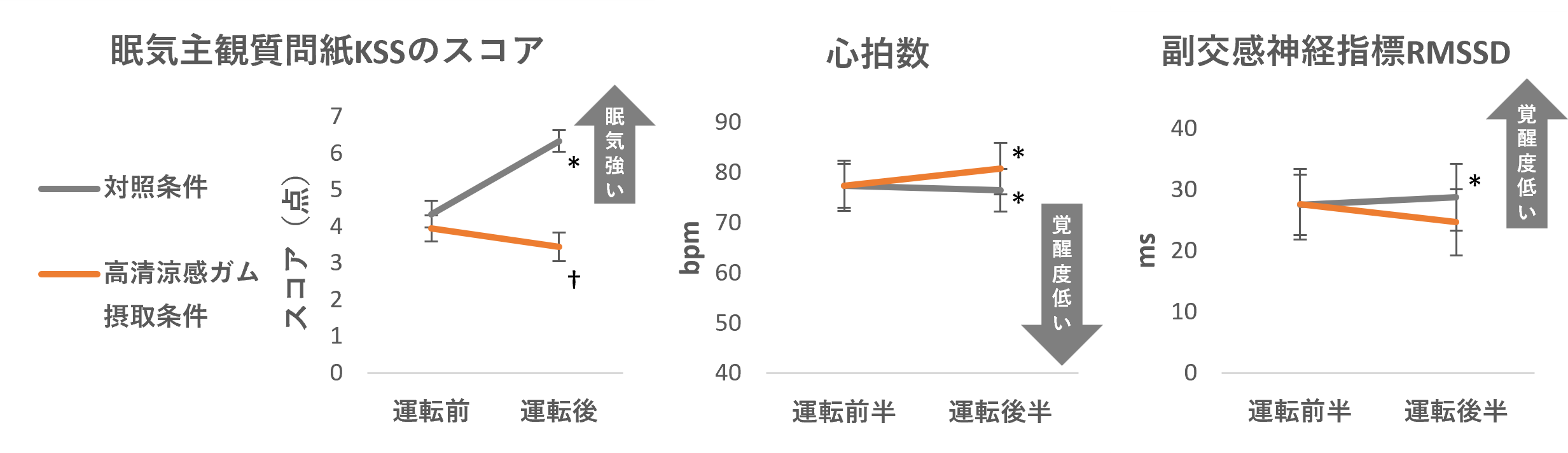 【方法】レベル2~レベル3の自動運転を模した環境下で、運転の後半に25分間、高清涼感ガムを咀嚼し、主観眠気質問紙、自律神経指標等を評価
