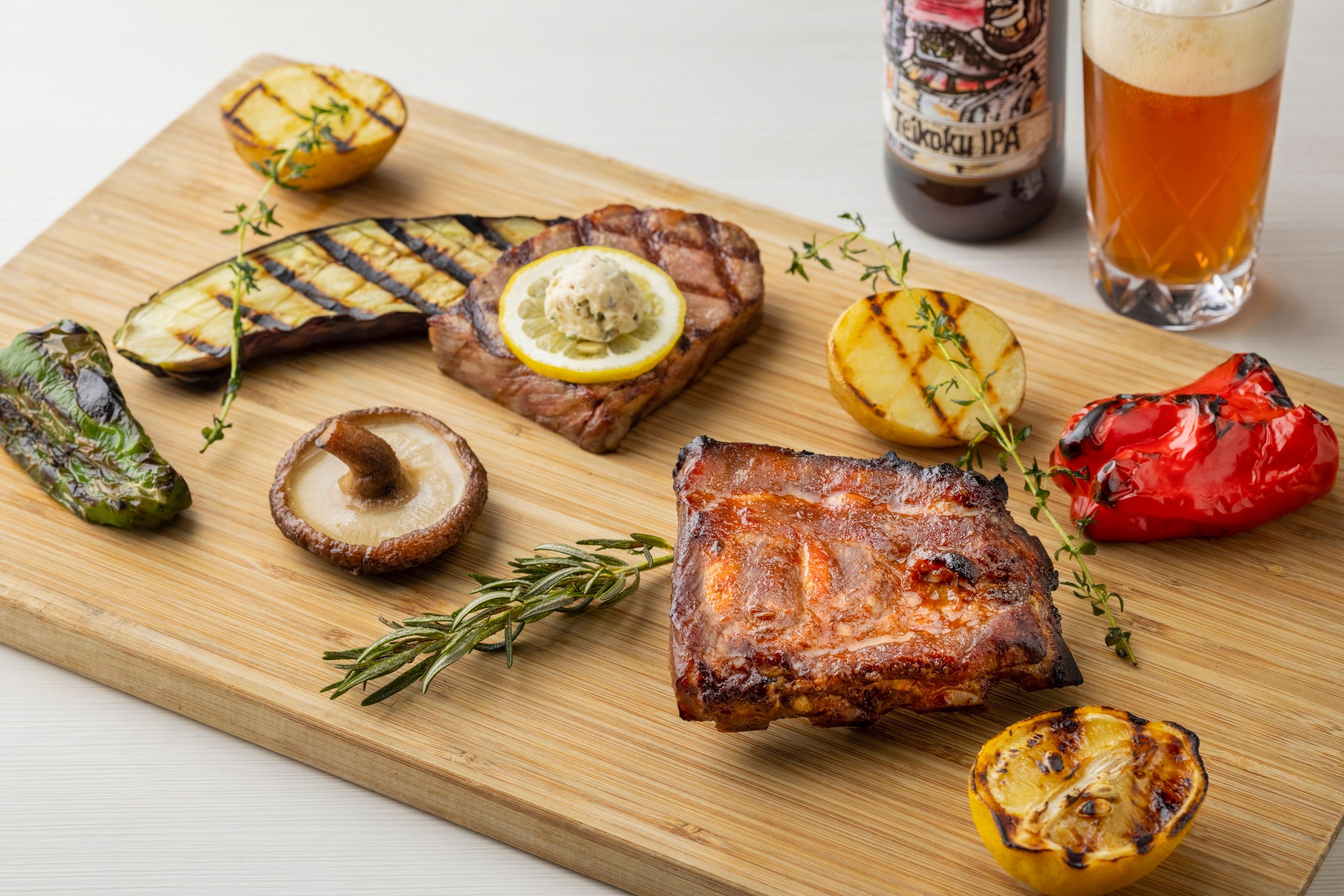 夏の香りとスパイス、そしてクラフトビールの個性が一皿ごとに重なり合う、シェアプレートディナーをご用意いたしました。天城の清流が育てた紅姫あまごを用いたアミューズ。前菜にはイズシカソーセージと夏野菜を香ばしく仕上げた彩り豊かなアヒージョを、スープは魚介と美味鳥の旨みが溶け合う風味豊かなブイヤベースなど土地の恵みを軸にした多彩な味わいが楽しめるラインナップです。メインには、国産牛サーロインとBBQバックリブのグリルにビールステーキバターを合わせた一品をテーブルにお持ちします。