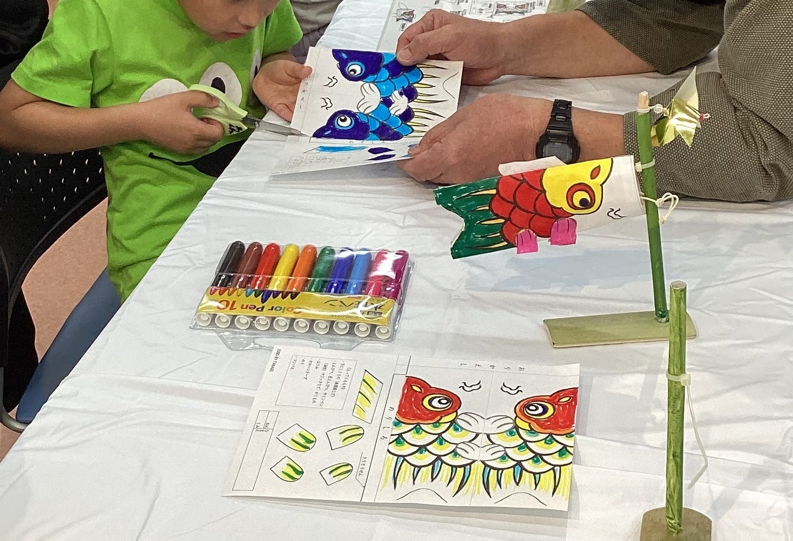 手描きこいのぼり体験教室の様子 かしわもちの販売