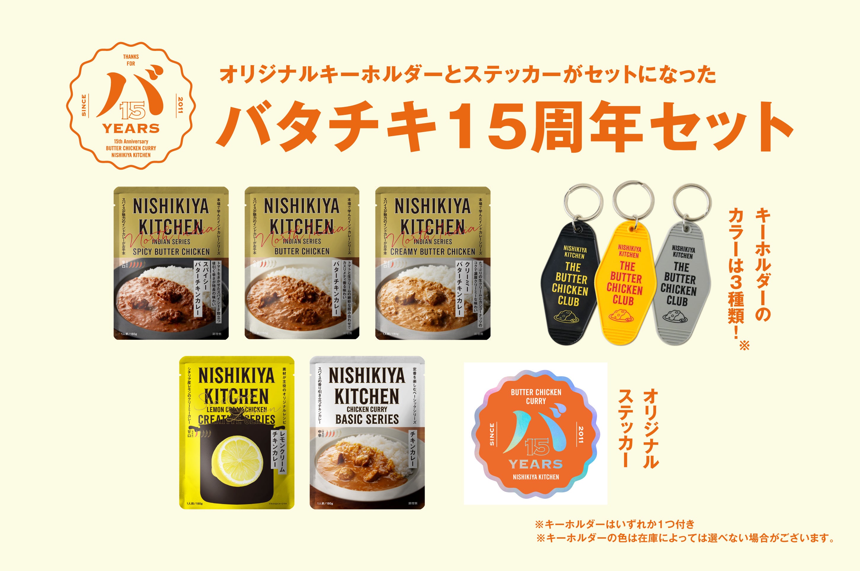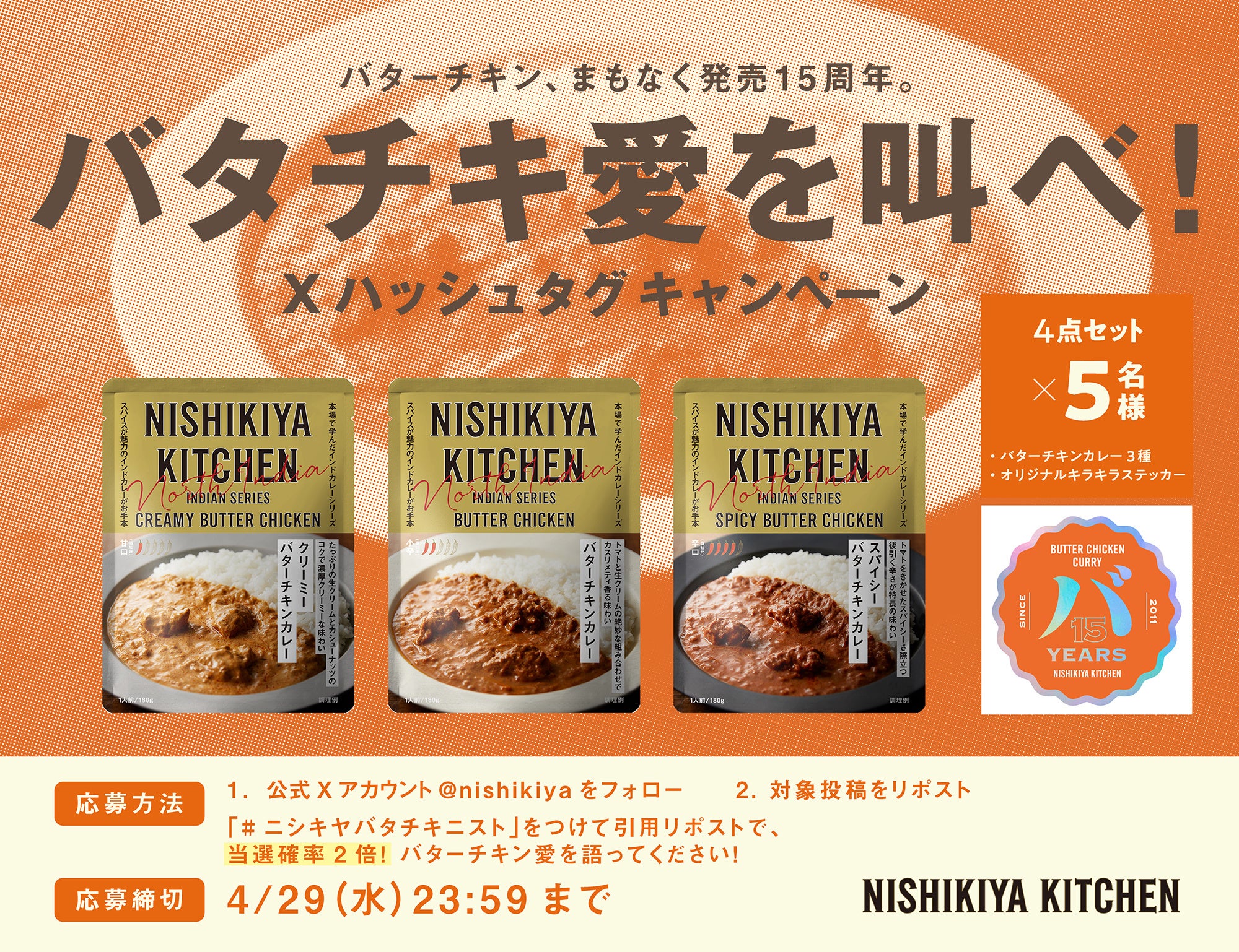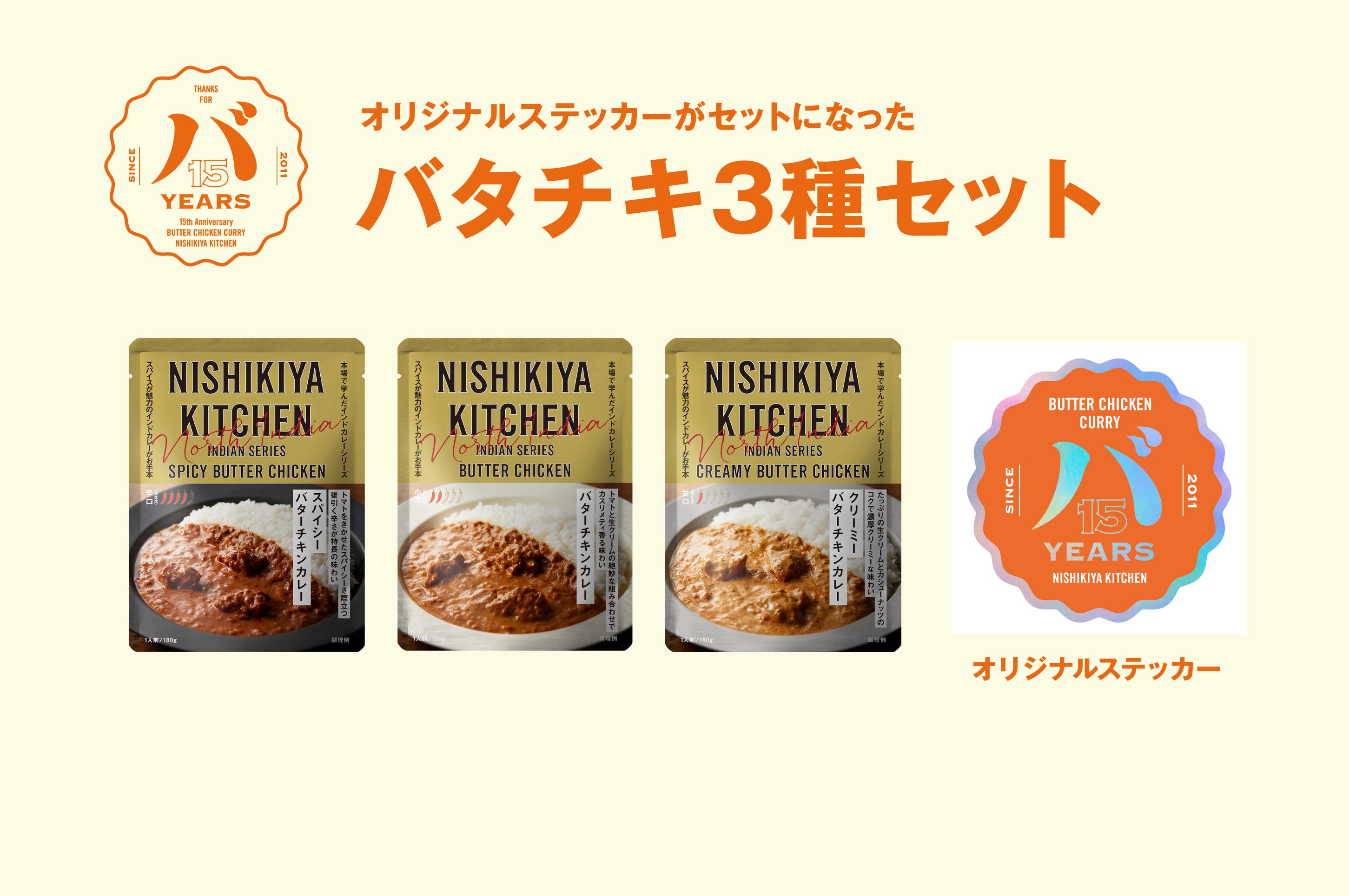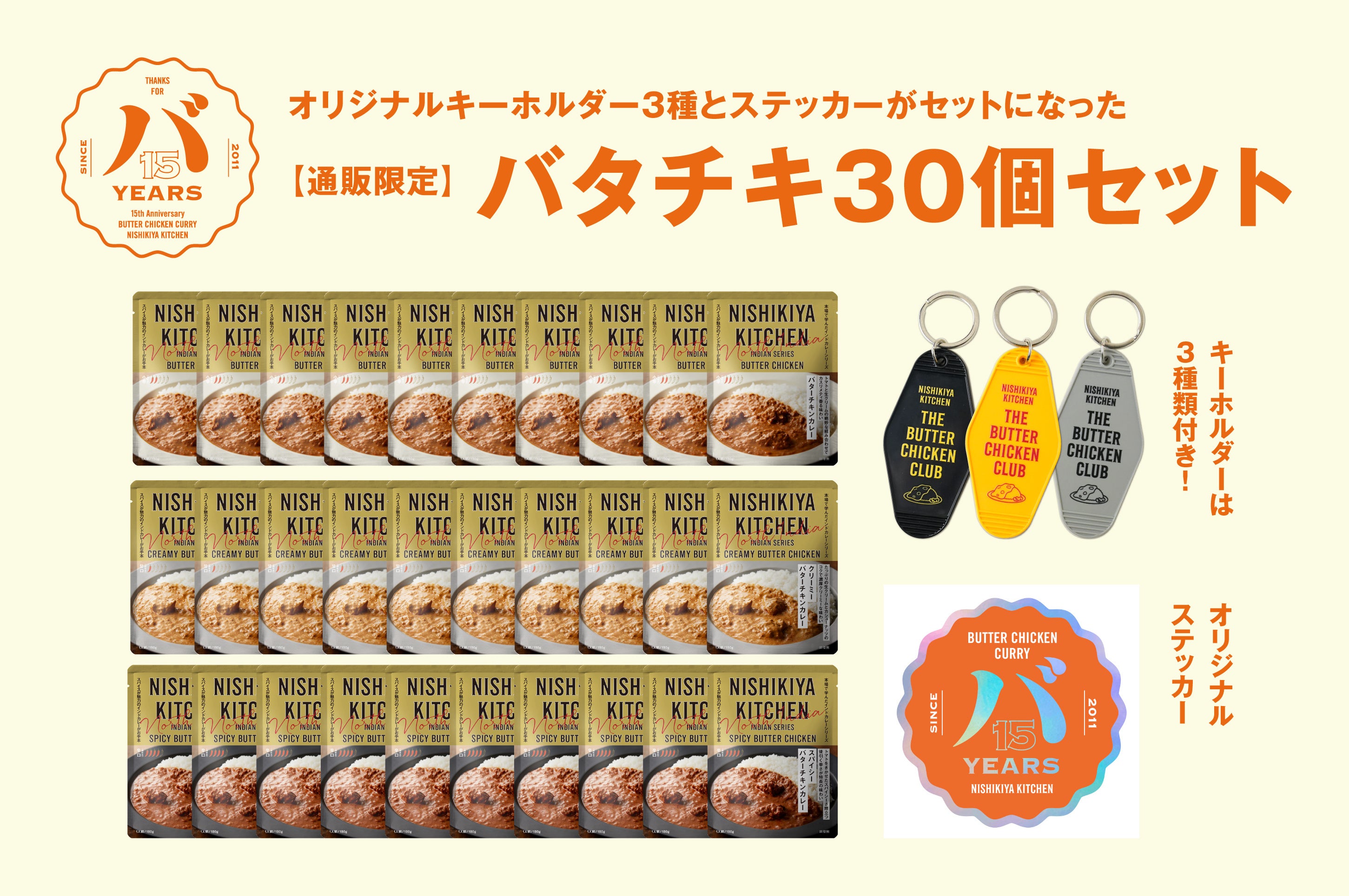 「世界の料理を『カンタン』に。」をコンセプトに掲げ、レトルトカレーを中心に約120種類のレトルト食品を販売する専門店NISHIKIYA KITCHEN(ニシキヤキッチン)(株式会社にしき食品 本社:宮城県岩沼市、代表取締役社長:菊池洋一)は、ニシキヤキッチンの看板商品であるバターチキンカレー発売15周年を記念し、2026年4月23日(木)から5月13日(水)の期間限定で「バターチキンカレー15周年感謝祭(略称:バタチキ感謝祭)」を公式オンラインショップと実店舗で開催します。これまで支えていただいたお客様へ感謝を届けるべく、「バターチキンカレー」を詰め合わせた「バタチキ3種セット(ステッカー付き)」と「バタチキ15周年セット(オリジナルキーホルダー&ステッカー付き)」を期間限定で販売します。ニシキヤキッチンはこれまでカレーの本場インドに20回以上通い現地の本格的な味わいを学び、バターチキンカレーの味わいもこの15年でさらにおいしく進化をし続けてきました。長年愛され続けてきたバターチキンカレーのみならず、甘口で食べやすい「クリーミーバターチキンカレー」や辛さとスパイスの香りを楽しむ「スパイシーバターチキンカレー」3種類の「食べ比べ試食」も実店舗で開催します。