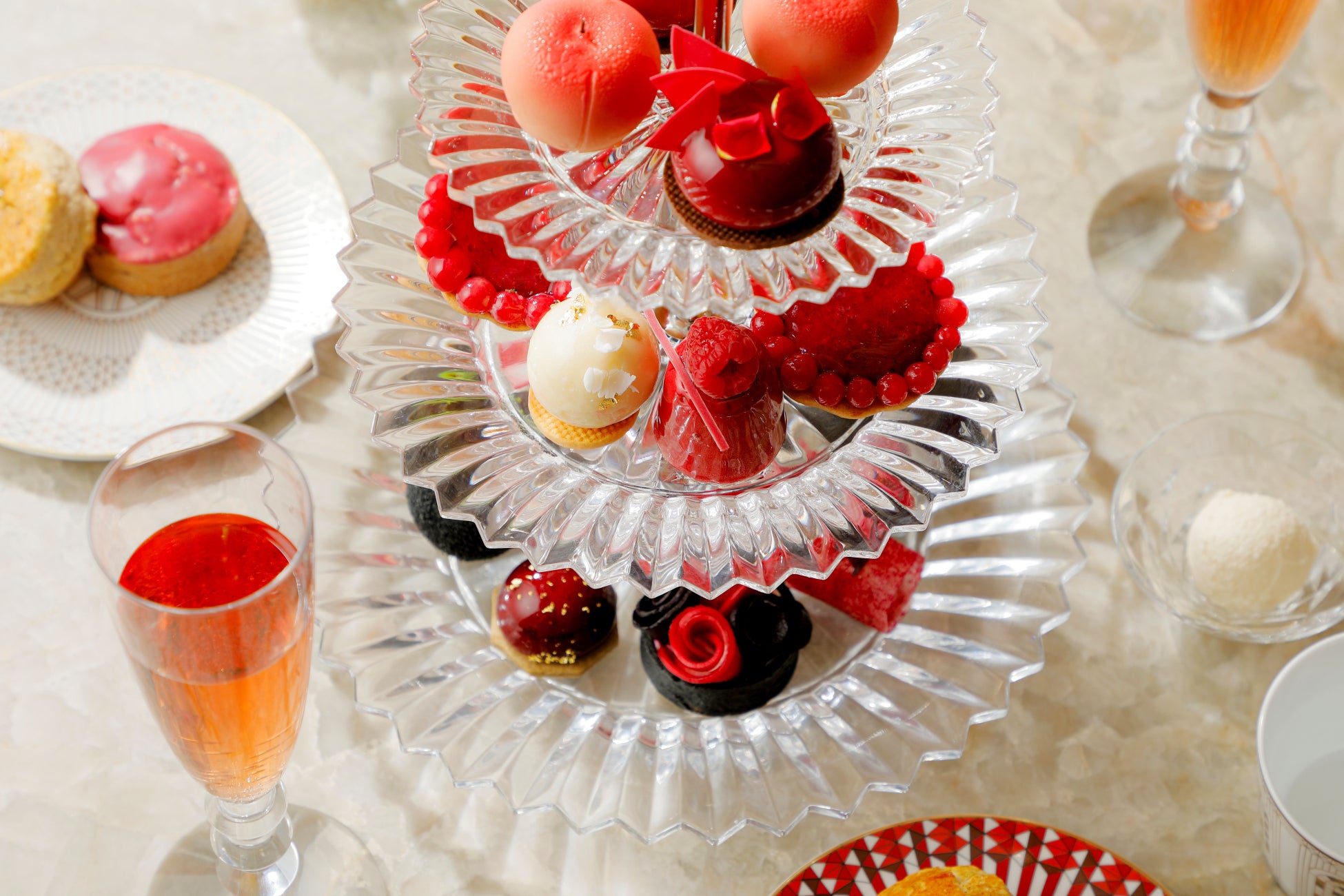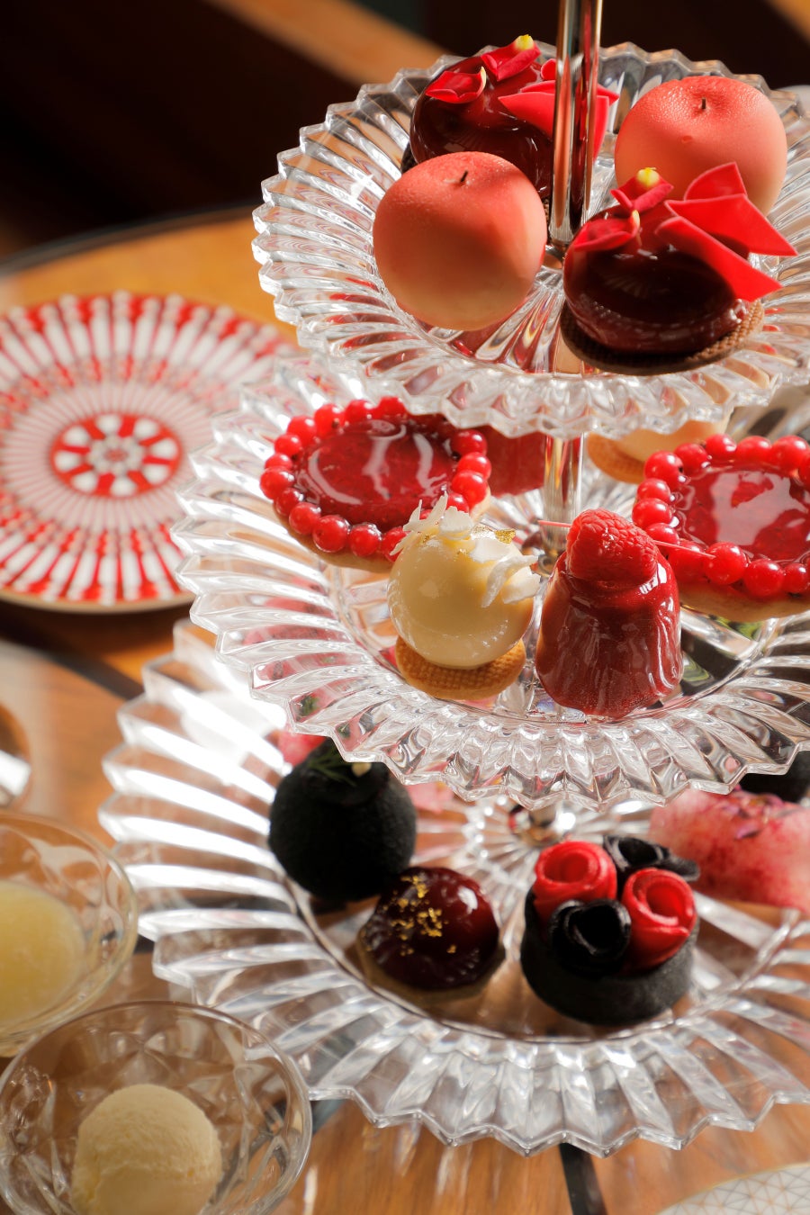 メゾンを象徴するシグネチャーカラー「レッド」をテーマに、エレガントに仕上げた3段のティースタンド。