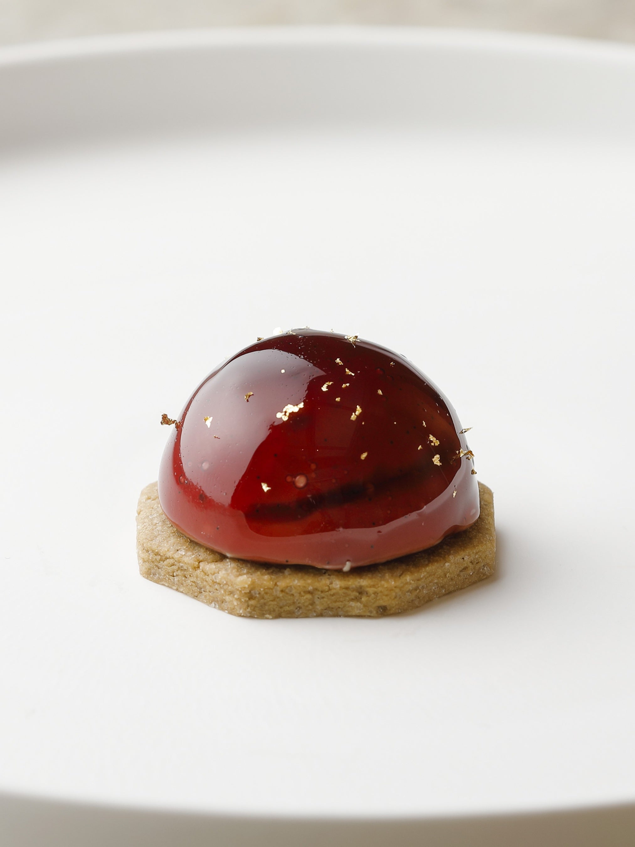 アイコニックなレッドのコーティングを纏ったフォアグラムースを、シャンデリアのパーツから着想を得た八角形のフォルムに型取ったバニラサブレに重ねたひと品。ムースの中にはピーチコンポートを忍ばせました。ほうじ茶のほろ苦さが全体を上品にまとめる、エグゼクティブ・スーシェフ原田の一押しの「フォアグラ&ピーチムース」は、クラッシックな組み合わせをモダンな美しさへ昇華した、本アフタヌーンティーを代表するようなセイボリーです。エレガンスさとラグジュアリーさをサブレの上に重ねた贅沢な味わいをお楽しみいただけます。
