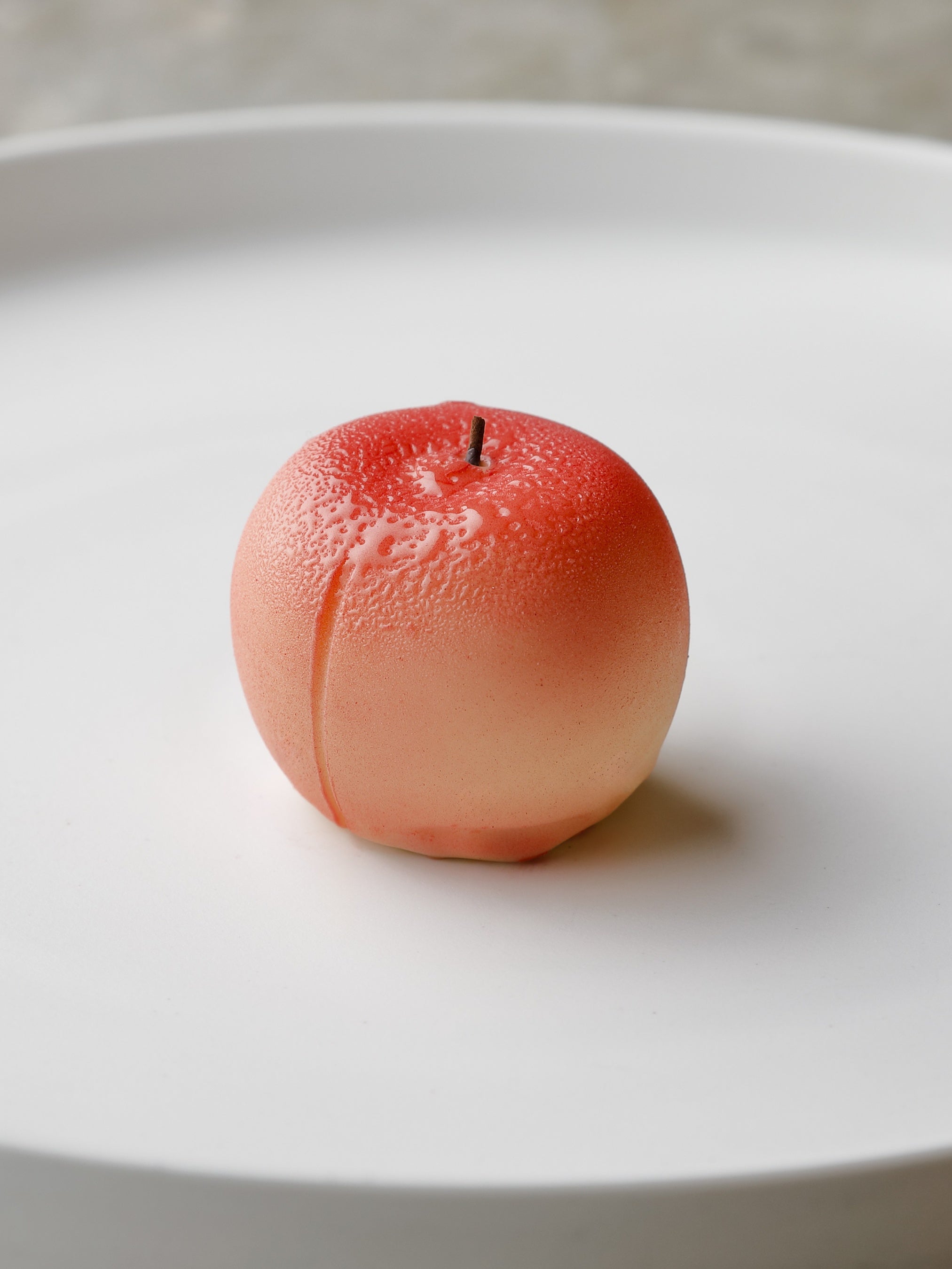 食材のテーマ「桃」に、バニラの芳香な香りを重ね合わせた“小さな桃”。