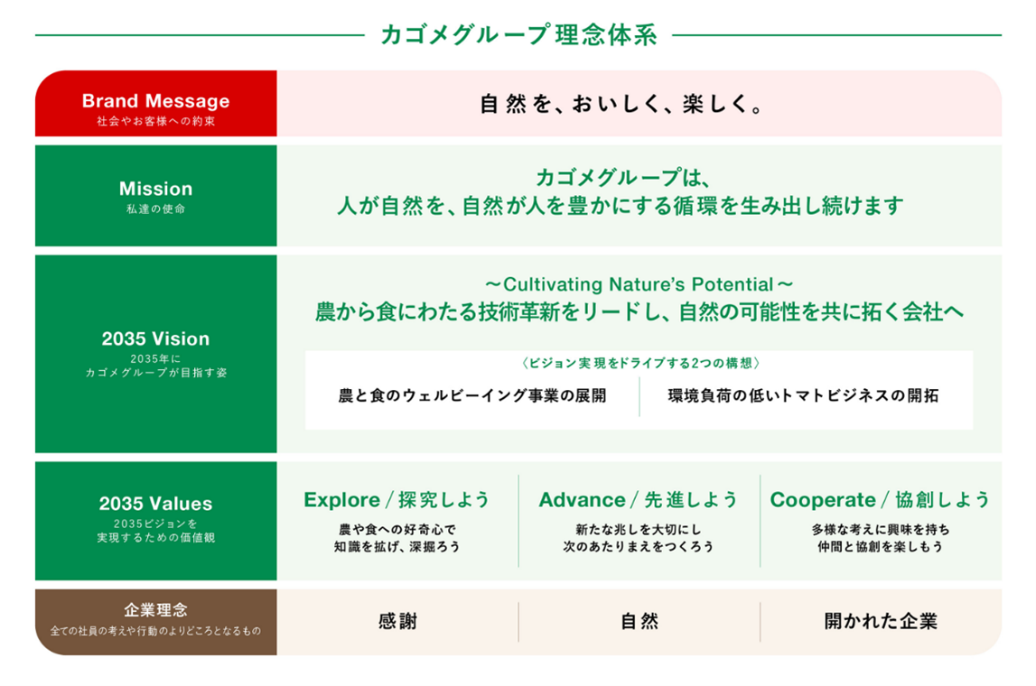カゴメグループは、2026年にこれからの未来に向けた新たな「ミッション・ビジョン・バリューズ」を策定しました。使命であるミッションは「カゴメグループは、人が自然を、自然が人を豊かにする循環を生み出し続けます」、目指す姿であるビジョンは「農から食にわたる技術革新をリードし、自然の可能性を共に拓く会社」と定めました。