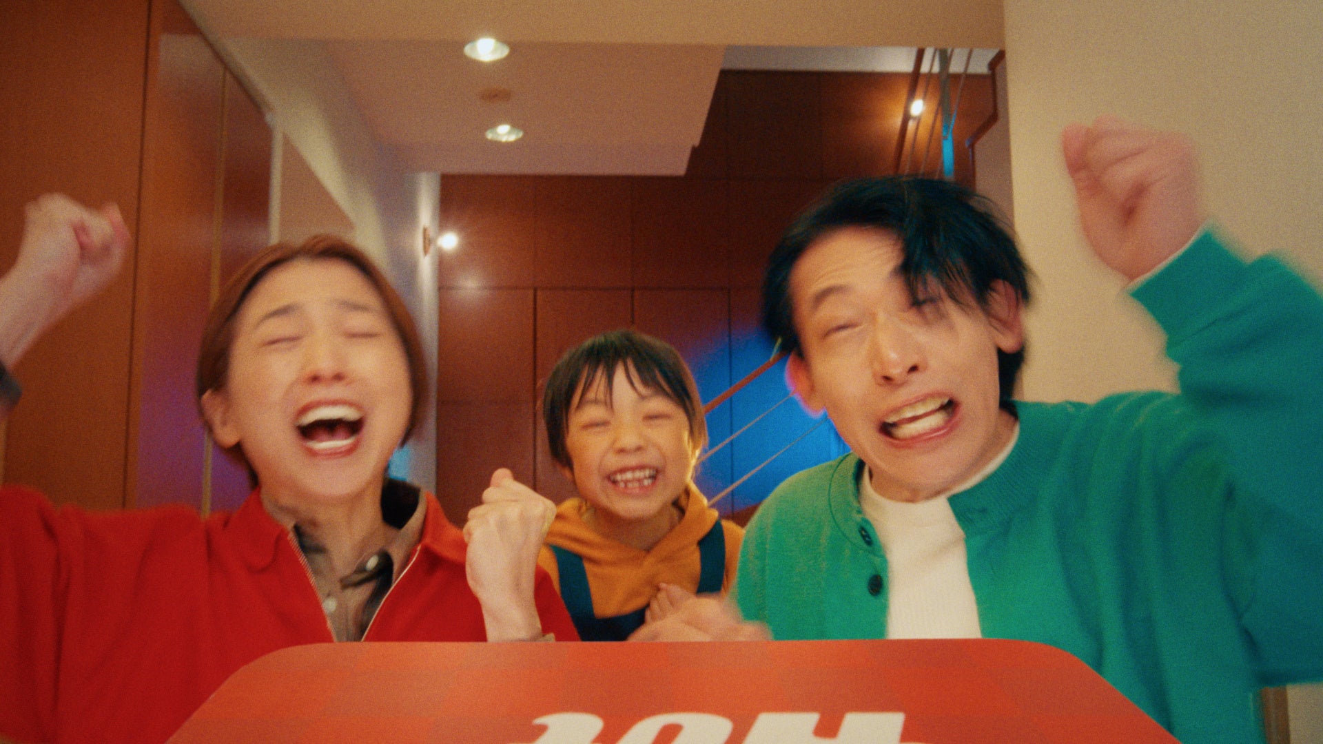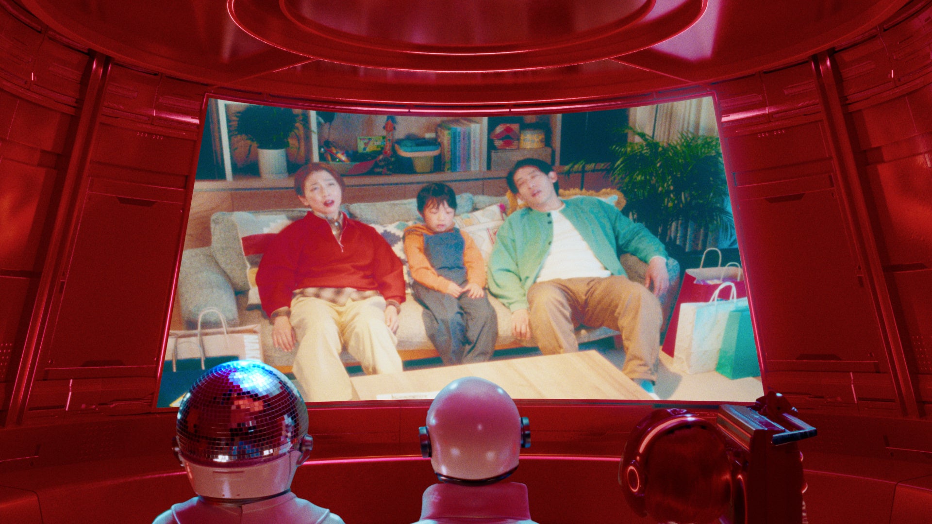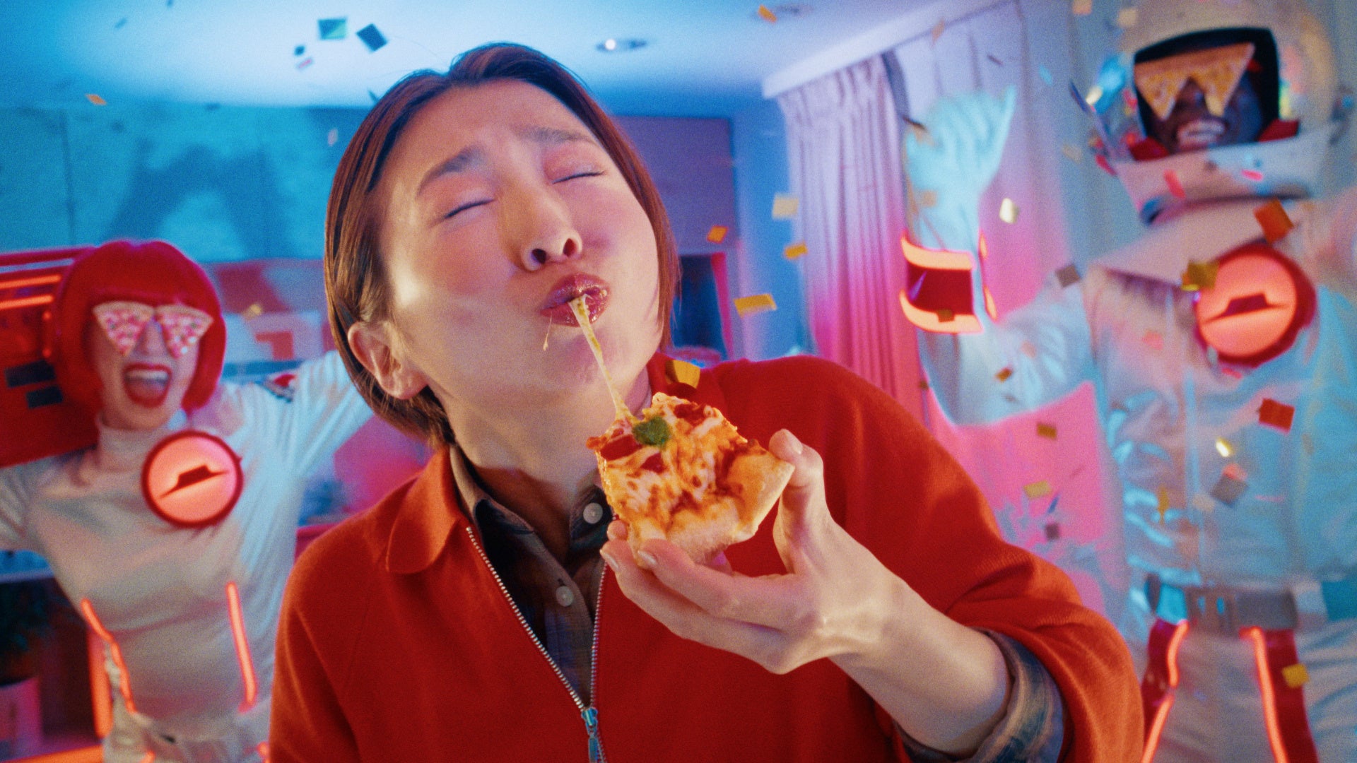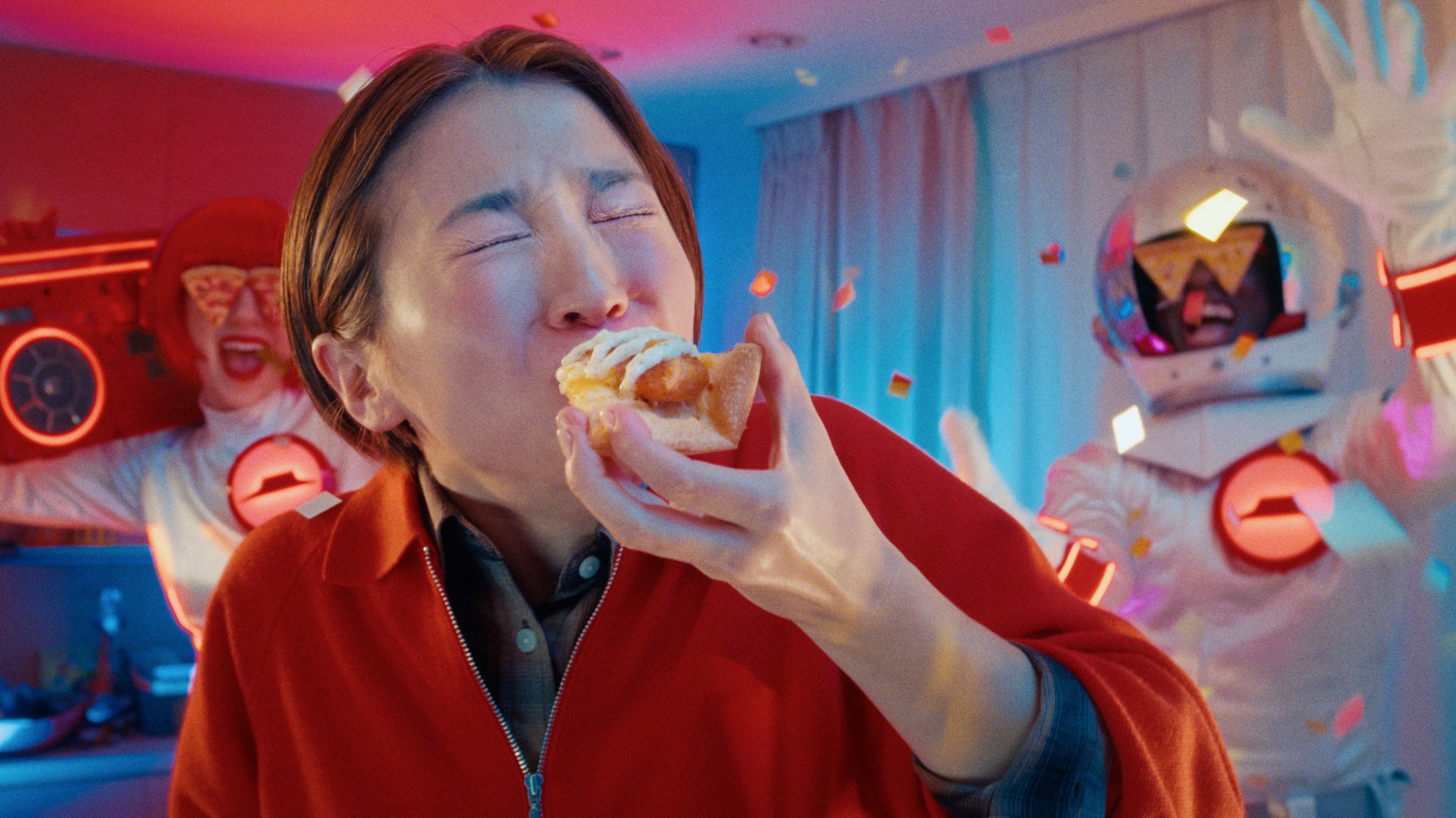 お出かけから帰宅した家族「つかれた~」と夕飯を作れる体力も残っていません。そこにピザハットロゴ型のUFOからハット星人が突如来訪!笑顔でピザを届けると、静かなリビングは「ピザだ~!」と大熱狂のパーティーフロアへ一変します。王道のマルゲリータを頬張り、家族が笑顔に包まれる後半では、「お持ち帰りなら2枚目無料♪」という軽快で耳に残るBGMにあわせて、3人が満面の笑みで店舗からピザを持って駆け出します。おいしさはもちろん、お持ち帰りならではのお得感と高揚感を、ハッピーに描いたストーリーです。