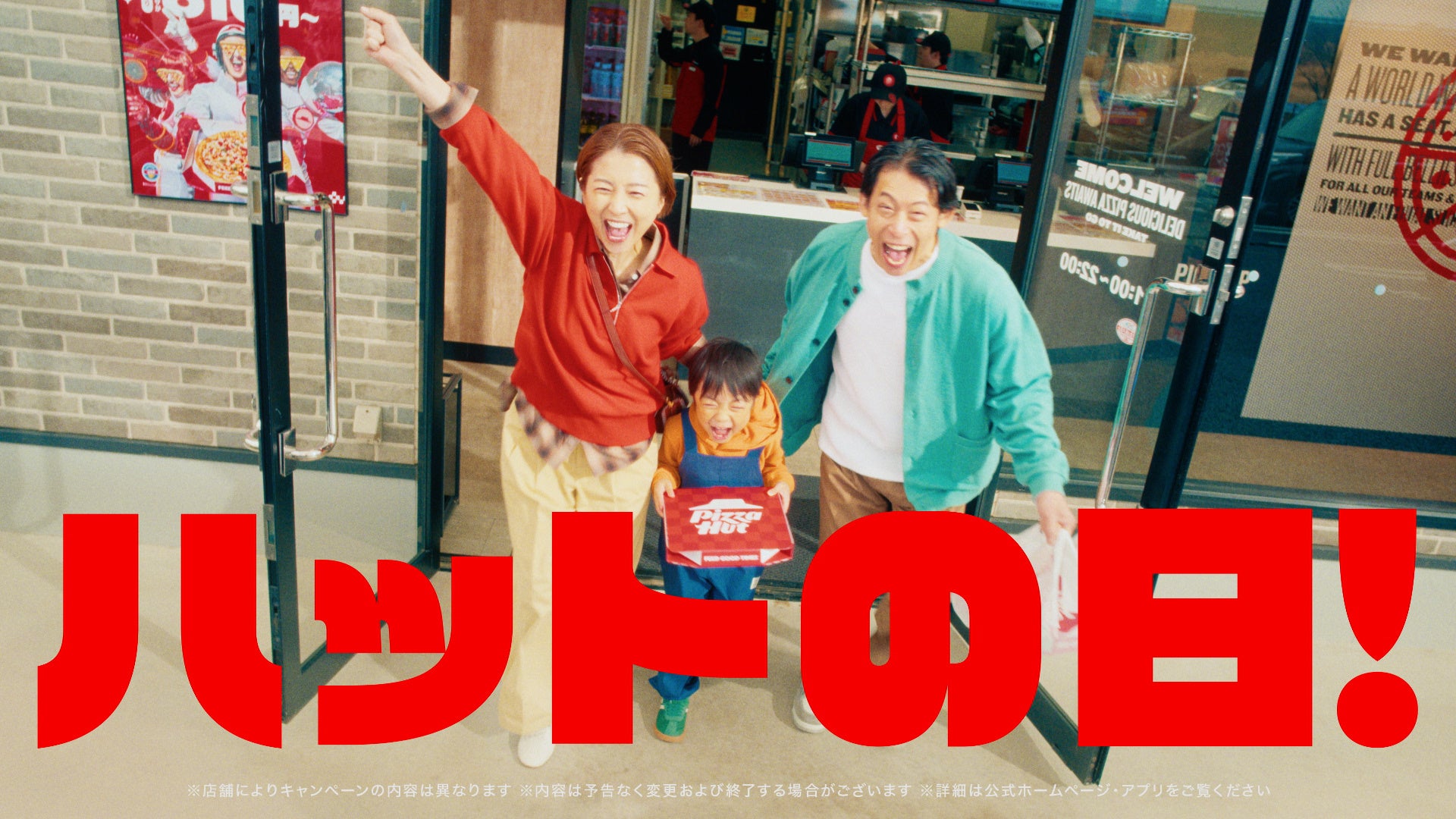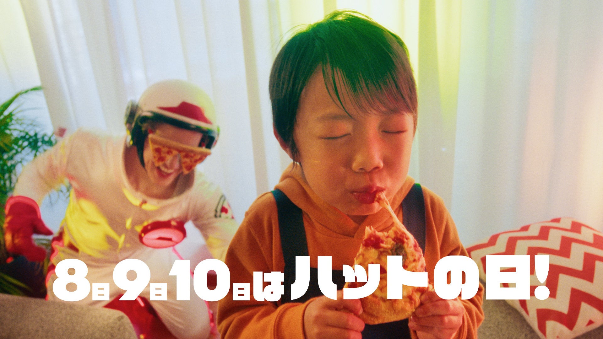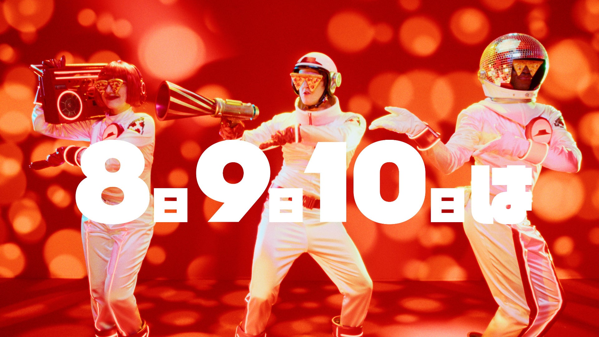 新CM「ハットの日」篇では、これまでのシリーズとは異なるポップでリズミカルな世界観の中、「ピザハット~がやってくる~♪」という耳に残るBGMに合わせてハット星人が軽快なダンスを披露します。続いて、「8・9・10はハットの日~!」というフレーズとともに、家族3人がピザをテイクアウトしてうれしそうに店を後にするシーンを展開。後半では、家族それぞれがピザを頬張るおいしそうなカットがテンポよく映し出され、最後は「ピザピザピザピザ お持ち帰りなら810円!」というリズミカルなフレーズで締めくくられます。楽しい音楽と軽快な演出を通じて、「ハットの日」のお得感とワクワク感を印象的に伝えるCMです。