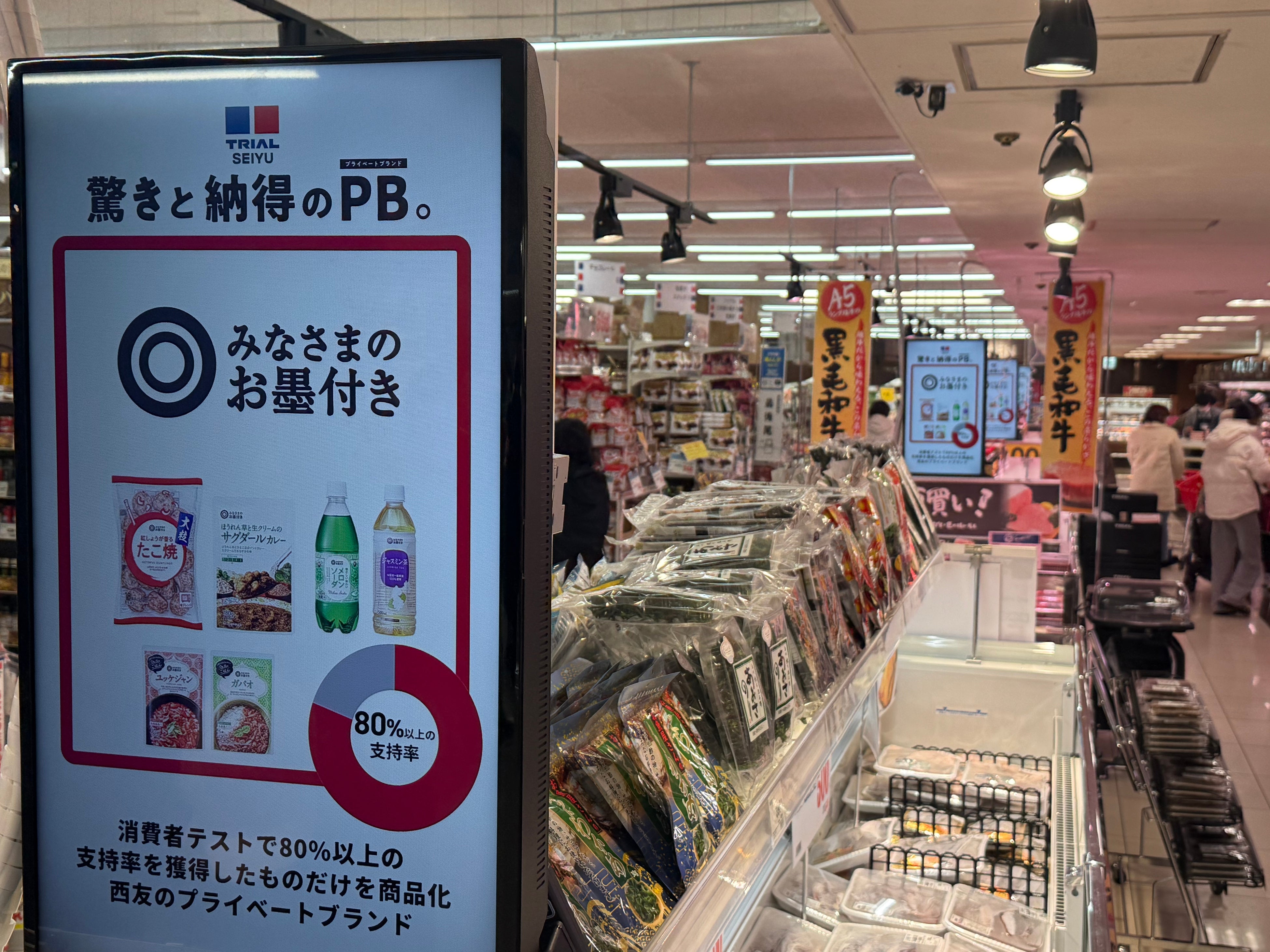 「トライアル西友」は、“おいしい食”と“便利な買い物体験”を融合した新しい業態として、ITを活用したスマートな購買体験と、トライアルが誇るプライベートブランド(以下、PB)「おいしくなれ!」や西友の人気PB「みなさまのお墨付き」など、両社の強みを活かした品揃えを追求する新しいフォーマットです。