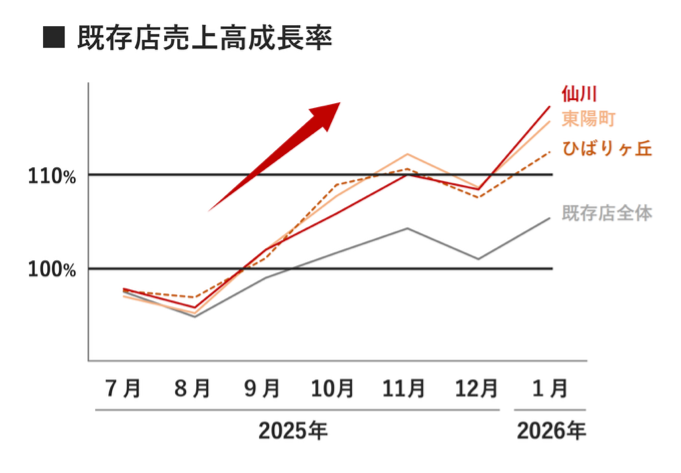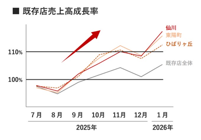 東陽町店(東京都江東区)およびひばりヶ丘店(東京都西東京市)では、経営統合直後の2025年8月より、トライアルの名物惣菜・PB商品の導入や売り場レイアウトの見直し、販促強化などの施策を実施し、お客様支持の向上に取り組んできました。その結果、両店舗ともに導入後、既存店売上高・客数が改善し、9月はプラスに転じ、10月には既存店全体の水準を上回る成長を実現しています。