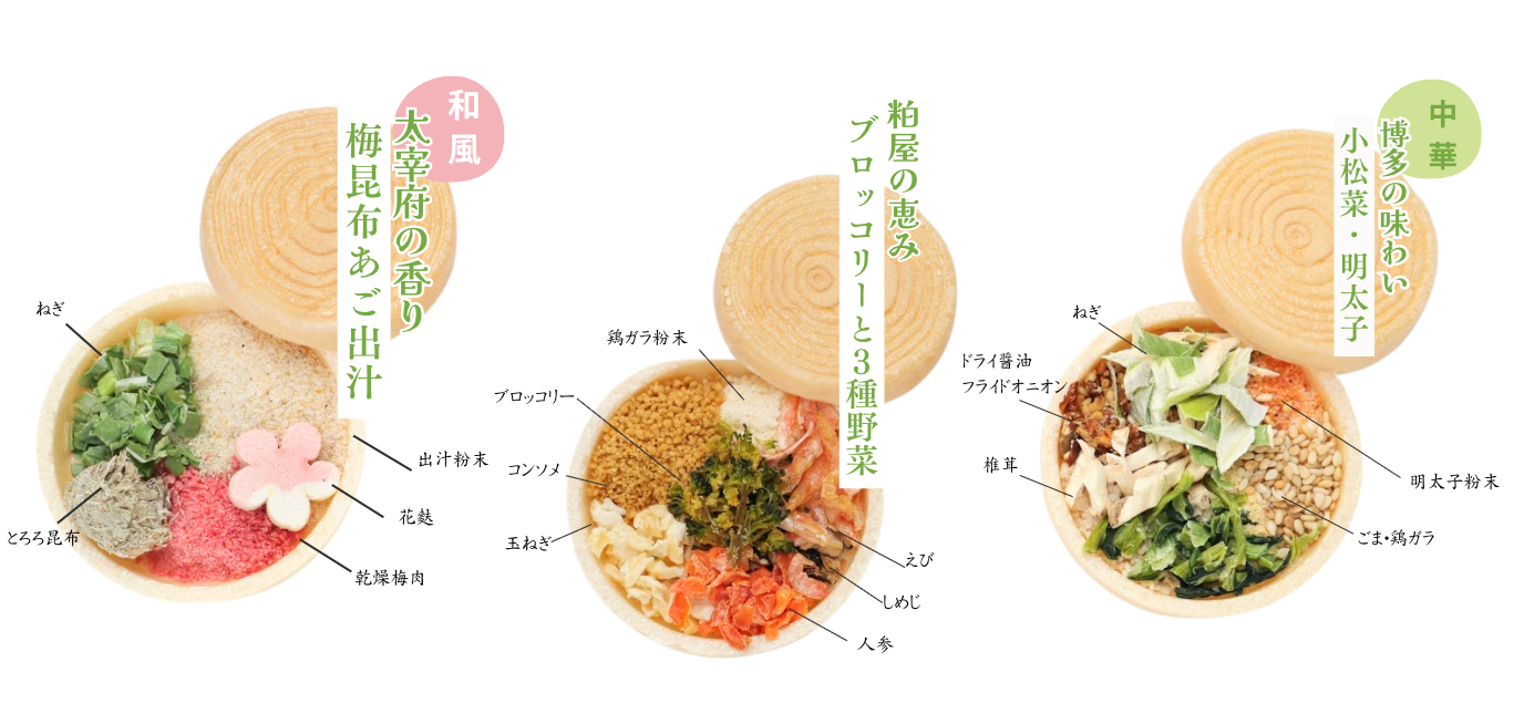 太宰府を象徴する梅の香りがふわりと立ち上り、とろろ昆布とあご出汁の深みのあるやさしい旨味がほっと包み込む和風味