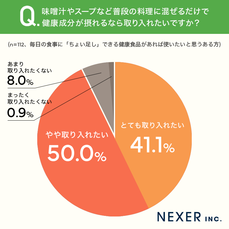 ■約91%が、普段の料理に混ぜるだけで健康成分が摂れるなら「取り入れたい」と回答