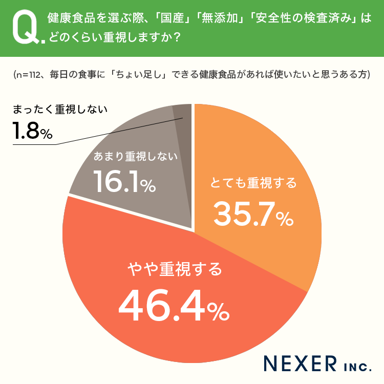 最後に、毎日の食事に「ちょい足し」できる健康食品があれば使いたいと思う方に、健康食品を選ぶ際、「国産」「無添加」「安全性の検査済み」はどのくらい重視するかを聞いてみました。