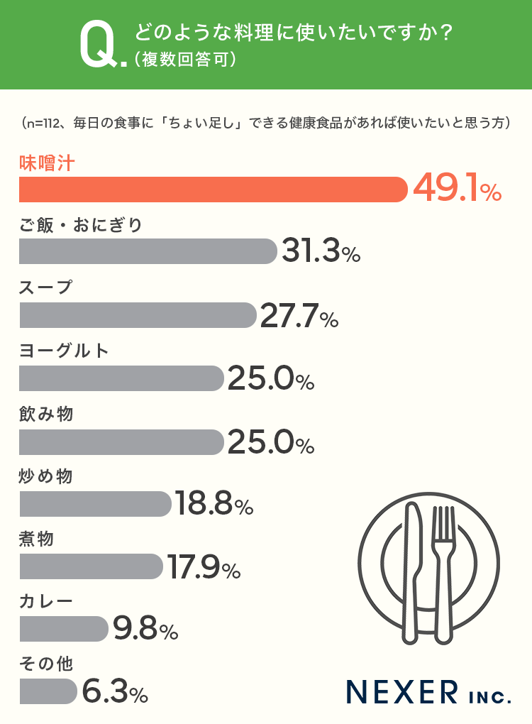 質問6:味噌汁やスープなど普段の料理に混ぜるだけで健康成分が摂れるなら取り入れたいですか?