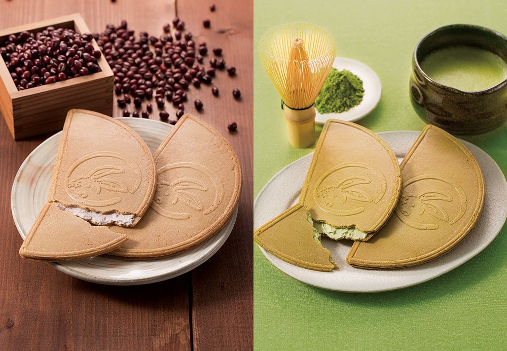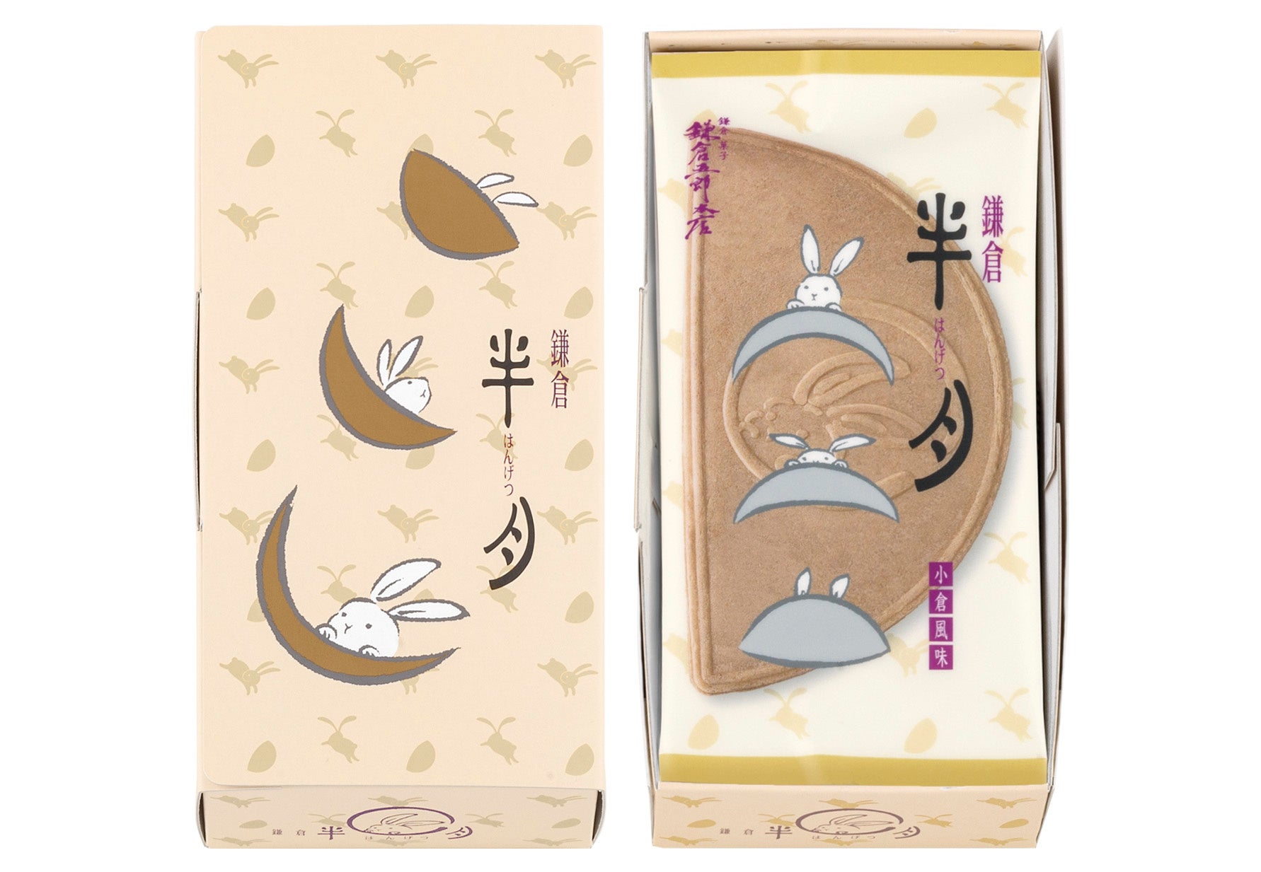 永年愛され続ける鎌倉名物。『鎌倉半月は月うさぎを描いた大きな半月のおせんべいに、ふわっと軽いクリームがたっぷりはさまれたお菓子です。カリッと「おいしい音」がする、ほかにない香ばしい食感は、お子様からご年配まで圧倒的支持をうけています。定番味は風味豊かな小倉風味と抹茶風味の2味です。