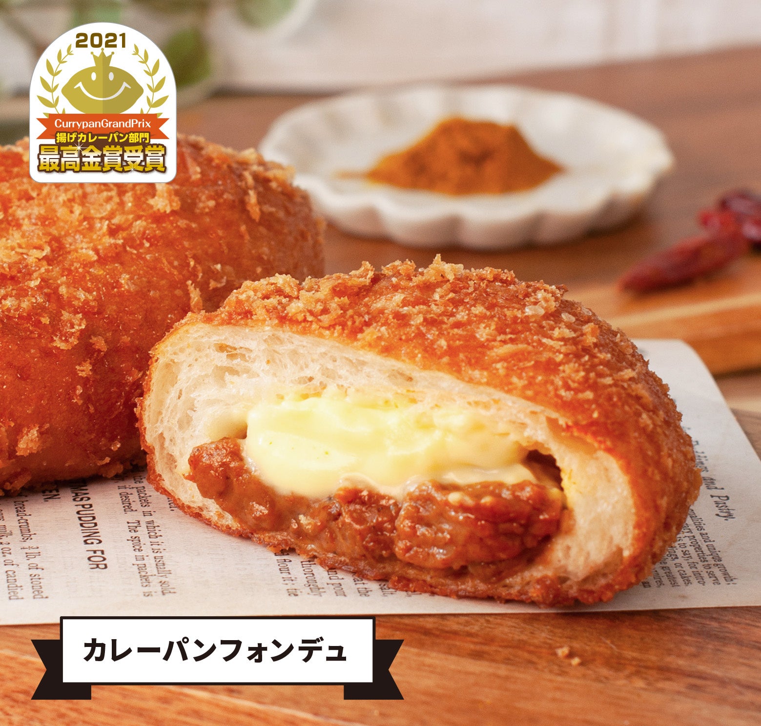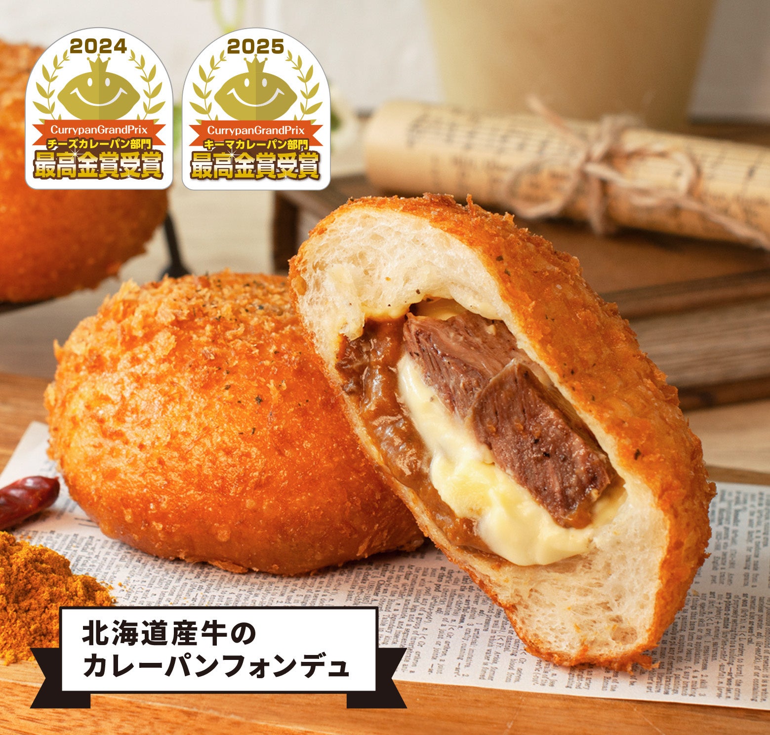 ※2 日本カレーパン協会主催( https://currypan.jp/gp )が主催するカレーパングランプリにおいて、2020・2022年度バラエティ部門で「海老カレーパンフォンデュ」が、2021年度東日本揚げカレーパン部門で「カレーパンフォンデュ」が、2024年度チーズカレーパン部門で「北海道産牛のカレーパンフォンデュ」がそれぞれ最高金賞を受賞し、日本一に輝きました。