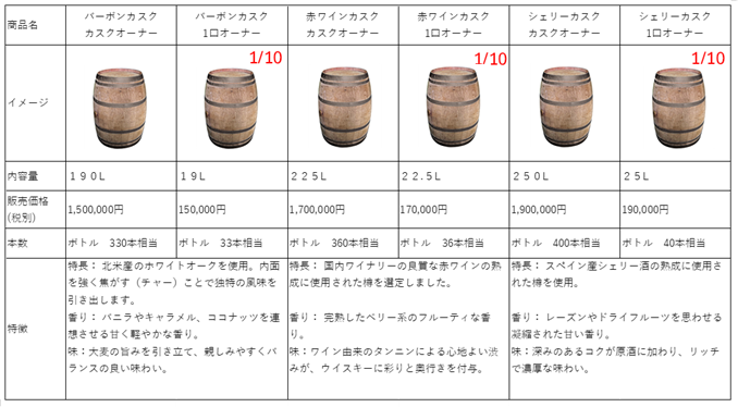 特徴: 今回は「聖光」のブレンドにも使用している『バーボン樽』『赤ワイン樽』『シェリー樽』の3種を受け付けます。お求めやすいよう、1/10から購入できる一口オーナー制度をご用意しました。