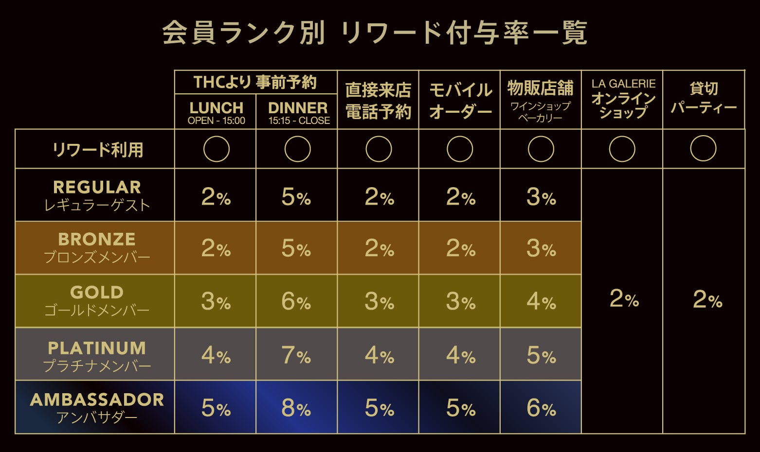 <会員ランク別 リワード付与率一覧>会員ランクに応じて、リワードの付与率がアップ!