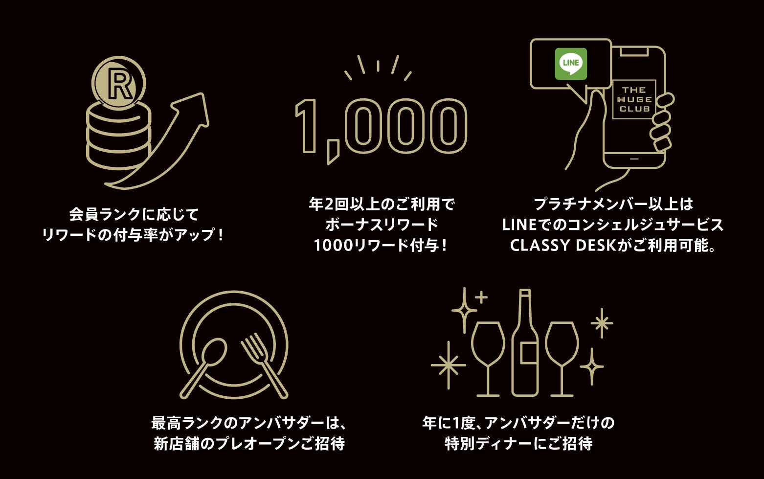 「The HUGE CLUB」は、「食事の時間そのものをより豊かにする」ことを目的に設計されています。来店体験と連動したリワード還元や、会員限定イベントなどを通じて、“日常の中の非日常”を提供してきました。