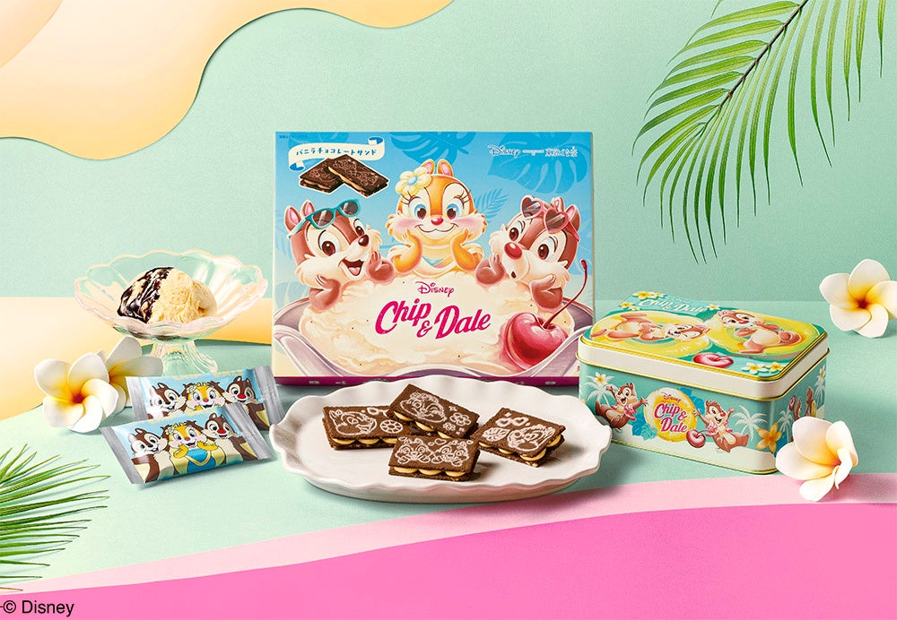 3匹で夏のバカンスを楽しむ様子が可愛い『チップ&デール/バニラチョコレートサンド』。なかよしコンビ「チップ&デール」と、憧れの「クラリス」との甘いひとときにメロメロになっちゃいそうな8枚入ボックスに、泳ぐのも波乗りも一緒に楽しむ「チップ&デール」が可愛いスペシャル缶。見ているだけで、常夏のリゾートにいるようなうきうきした気分になれそう!