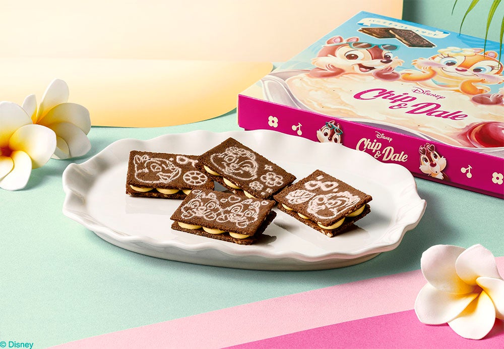 中のお菓子は、バニラアイスみたいな香り溢れるホワイトショコラを木の実が大好き「チップ」と「デール」も大満足のチョコナッツ生地にサンドしました。お菓子の絵柄は全部で4種類。ランダムで入りますので、何が出るかはあけてからのお楽しみです。夏にぴったりなデザートサンドを、サクサク頬張って召し上がれ!