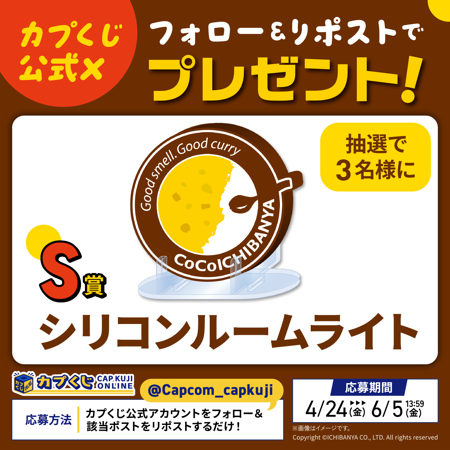 こちらは“RP賞”と題して、カプくじオンラインのアカウントをフォローし、対象のポストをリポストすることで、抽選で3名様に「S賞:シリコンルームライト(全1種)」をプレゼントいたします。是非この機会をお見逃しなく!
