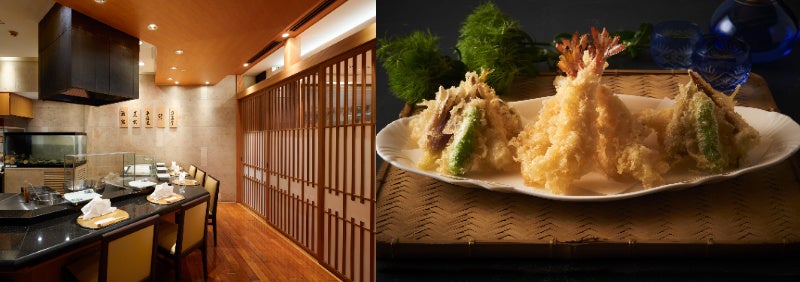 鮨・天麩羅・鉄板焼それぞれの専用カウンターを設けた「羽衣」。熟練職人が、四季折々の日本の美味を奏でます。カウンター席で職人との会話を楽しみながら、お目当ての品を間近に、好きなものを少しずつお愉しみいただけます。また、個室やテーブル席のご用意もございます。