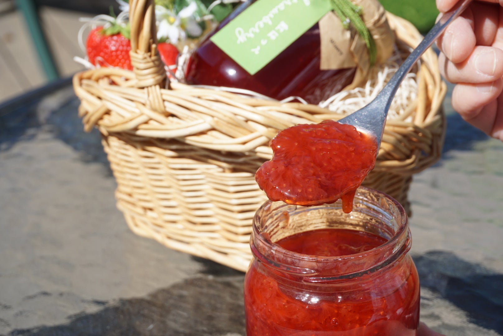 「紅ほっぺ」という品種のいちごを使っています。紅ほっぺは果皮・果肉ともに濃い赤色で、ジャムにした際も鮮やかで深い赤色に仕上がります。糖度と酸度のバランスが良く、果肉がしっかりとしているので、果肉のごろっと感を味わえます。