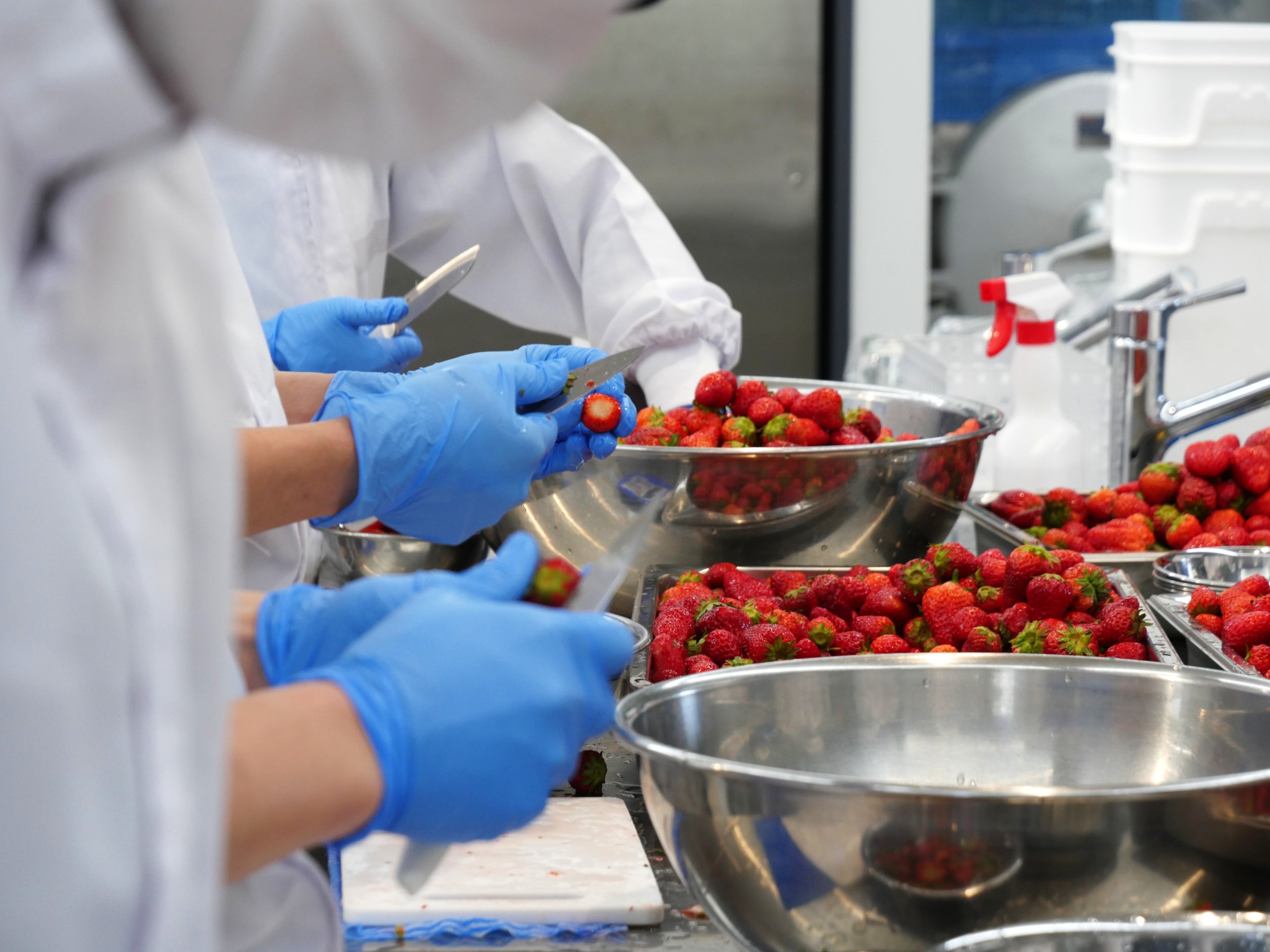 製造開始前には、開発担当者から「つくる時の気持ちは味に出る。このいちごのように、かわいい心で加工をしましょう」と声掛けがあり、和やかな雰囲気の中でスタート。農家直送の「紅ほっぺ」全110kgを、すべて手作業で洗浄し、一つ一つ丁寧にヘタを取り除きました。味わいを損なう未熟な部分の選別など、徹底した品質管理のもと、細やかな手仕事で製造を進めました。
