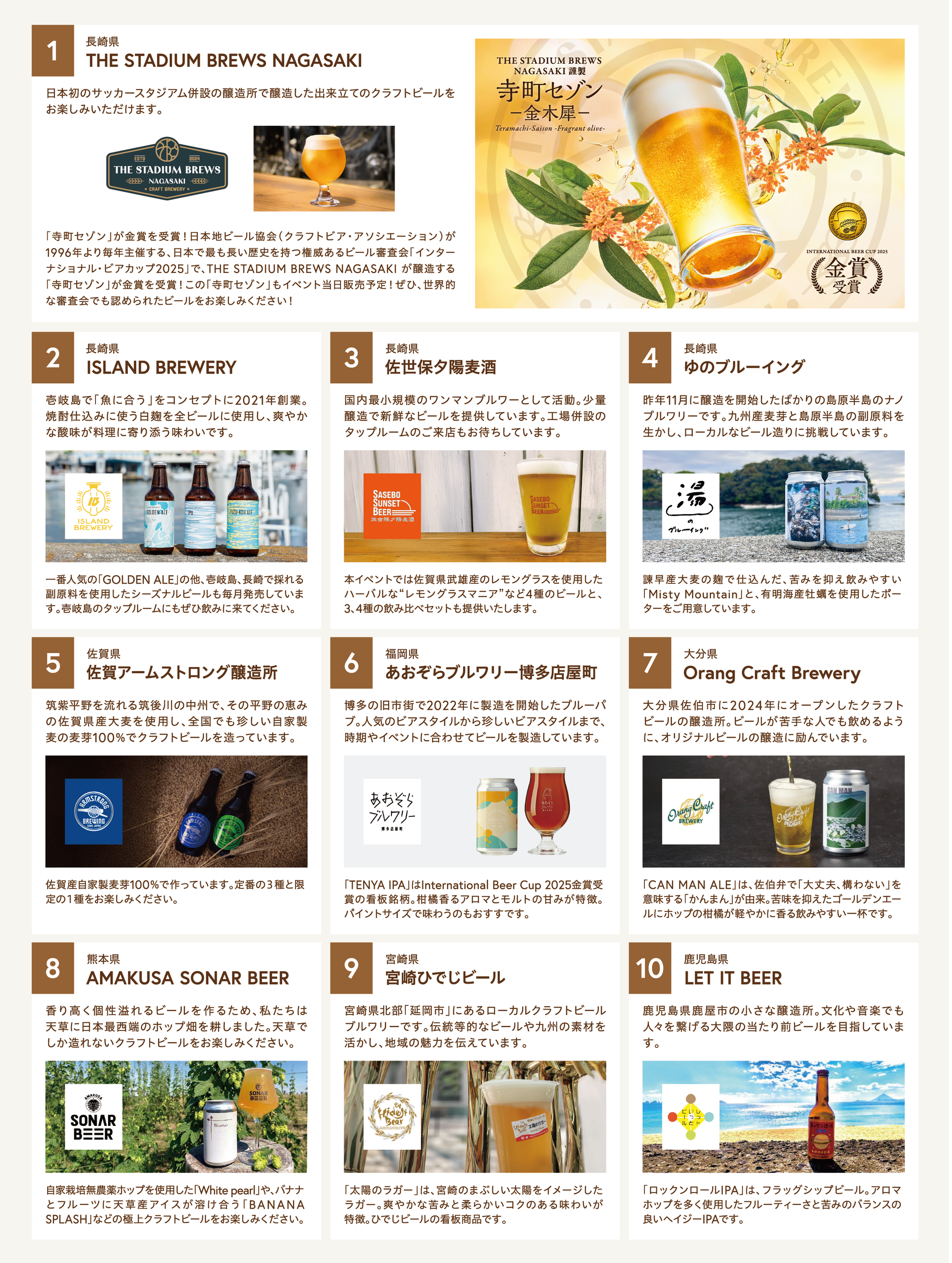 本イベントは、長崎スタジアムシティで開催されるビールイベントとして史上最多となる計10店舗のクラフトビール醸造所が参加します。開放されたスタジアムのロケーションを活かし、各地から届く希少なビールと、それらを引き立てる絶品グルメ、そして日替わりのエンターテインメントが融合します。世界基準の味から地域の知られざる一杯まで、初夏の心地よい風とともに特別な週末をお過ごしください。