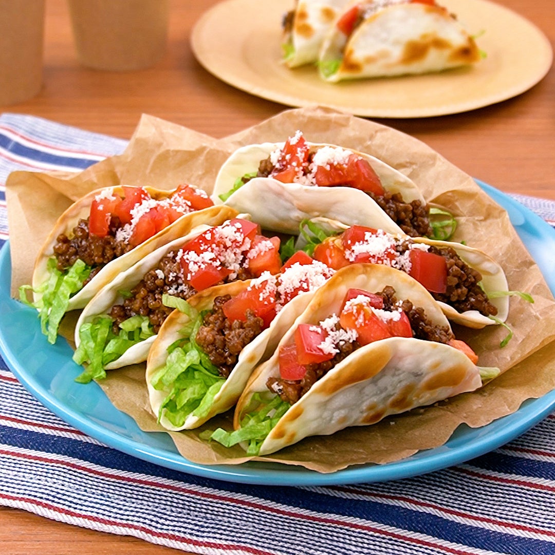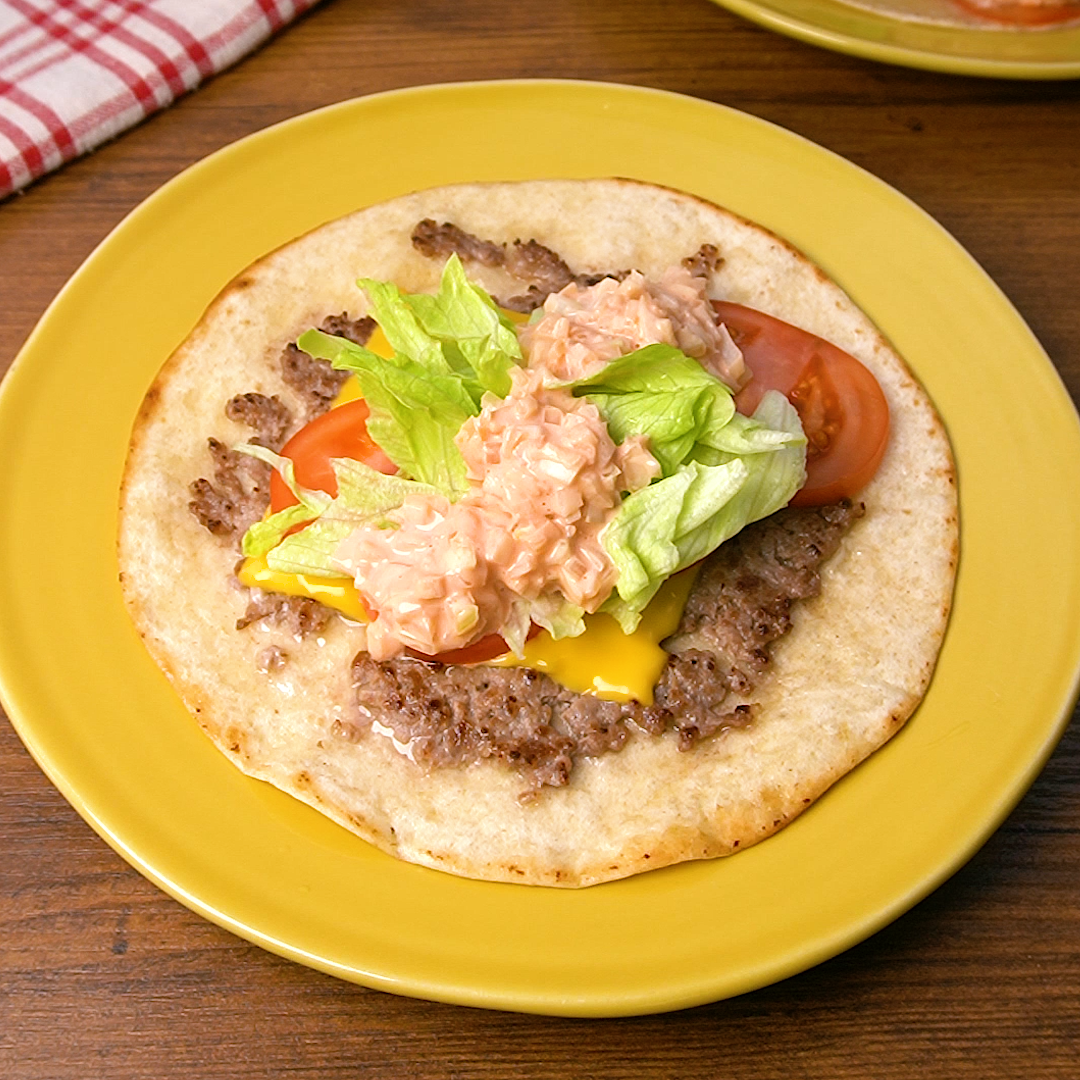トルティーヤの皮に合いびき肉を直接塗り広げて一緒に焼き上げる簡単ごはん!お好みの野菜をたっぷり挟んでお召し上がりください!