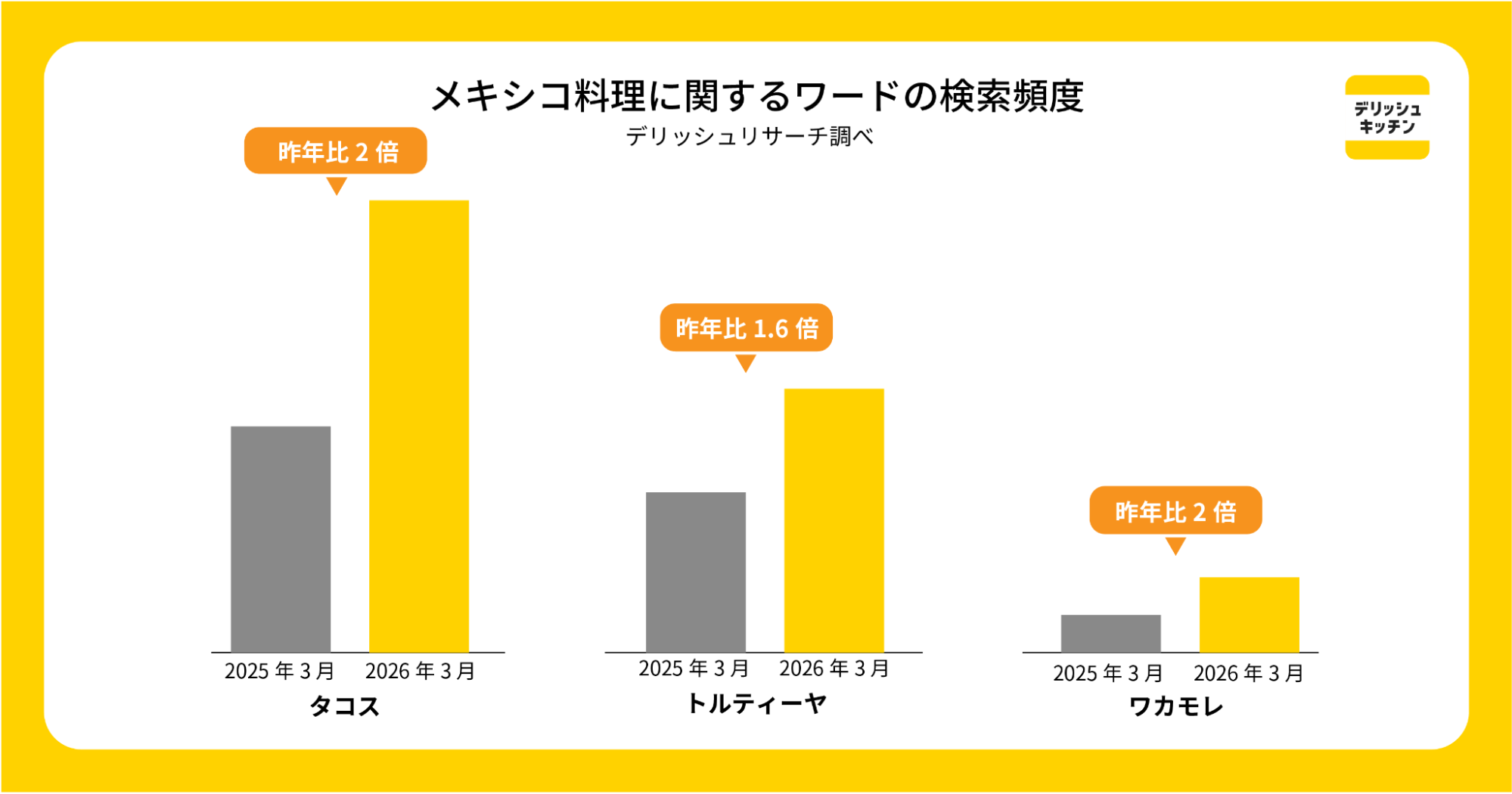 近年、メキシコ料理への注目度は高まりを見せ、タコス専門店をはじめとする店舗数も増加傾向にあると言われています。このブームは、『デリッシュキッチン』の検索データからも明確に裏付けられています。2026年3月における「タコス」のキーワード検索頻度は、2025年同月比で2倍に急増しました。さらに、タコスの生地となる「トルティーヤ」は同1.6倍、メキシカンの代表的なディップである「ワカモレ」も同2倍となるなど、メキシコ料理に関する検索頻度も軒並み上昇しており、「おうちでメキシコ料理を楽しみたい」という生活者の高い意欲が明らかになっています。