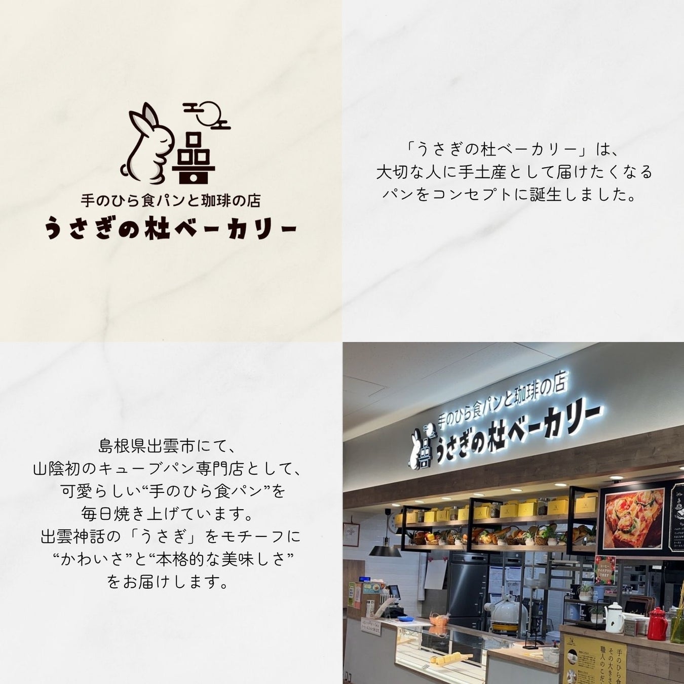 島根県出雲市にて、山陰初のキューブパン専門店として、可愛らしい“手のひら食パン”を毎日焼き上げています。出雲神話の「うさぎ」をモチーフに“かわいさ”と“本格的な美味しさ”をお届けします。