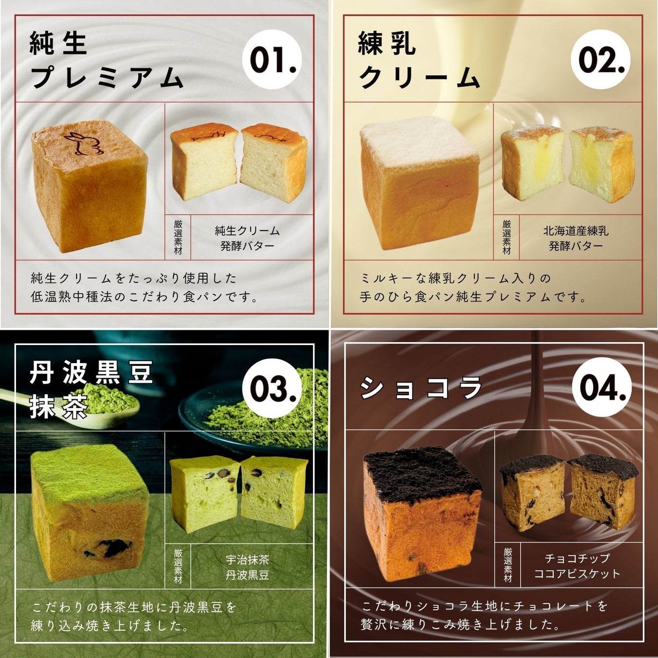 ◎ 手のひら食パン 4種8個セット(純生プレミアム・練乳クリーム・丹波黒豆抹茶・ショコラ) 各種2個ずつ 3,980円(税込)