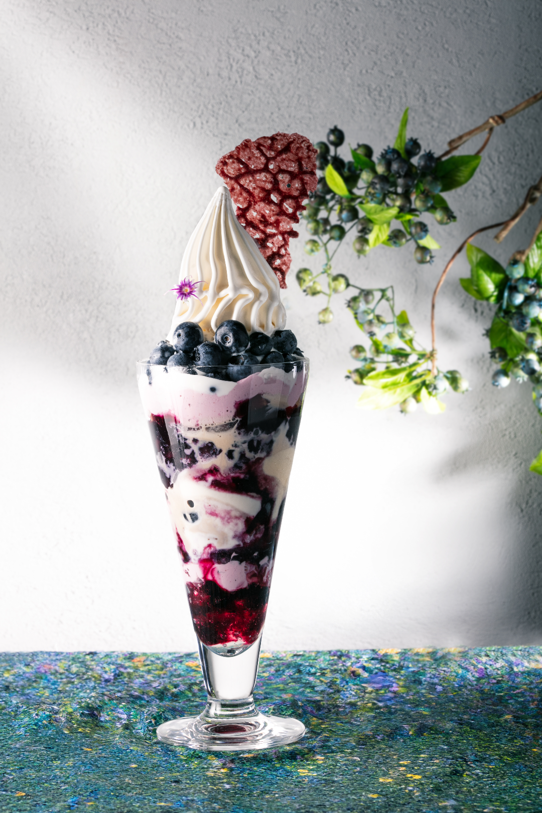 濃厚なコクから始まり、食べ進めるほどに軽やかでさっぱりとした味わいへと移ろう、最後まで飽きのこないパフェです。ラベンダーの優雅な香りがブルーベリーの魅力を引き立てる、洗練されたマリアージュをお楽しみください。