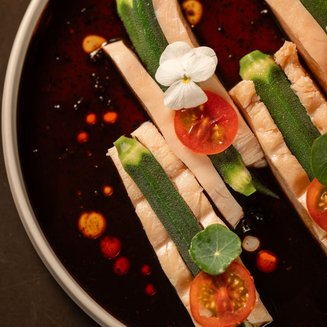 CENSU TOKYO にもあるオクラを挟んだよだれどりを、THE CONDE HOUSEで人気のよだれ鶏のピリッと甘辛いソースで仕上げております。東京と名古屋で異なるエッセンスを持つレストランのコラボの幕開けにふさわしい一品。