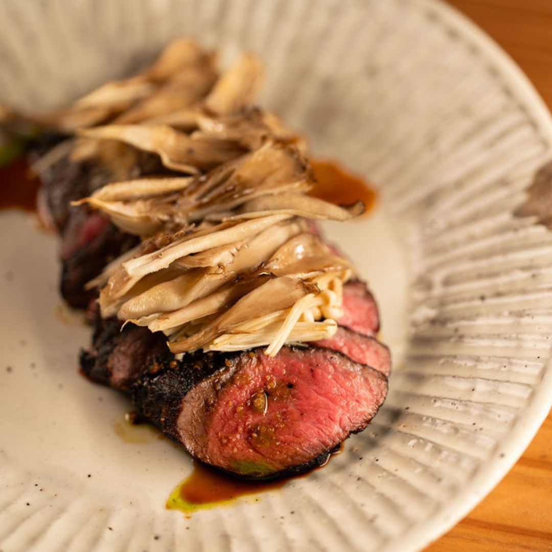 CENSU TOKYOの看板メニュー 和牛ランプ肉の炭火焼き。2種のキノコと炭で焼いた和牛の芳ばしさの相性がとても良く、薫香をまとった醤油のソースが食欲をそそる。このスペシャルコラボコースのメインを飾る。