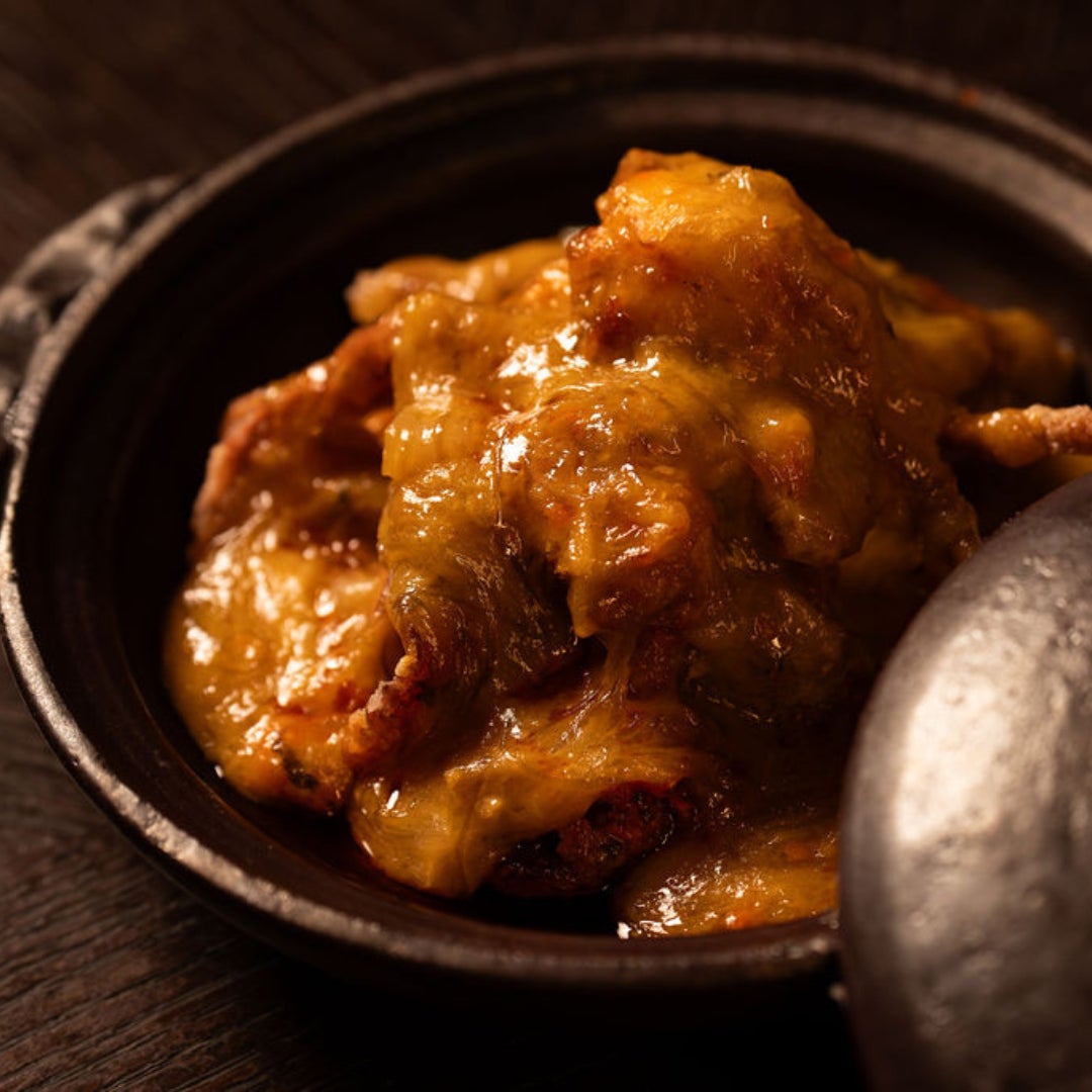 「ソフトシェルクラブ」の中でも、身入りの良いプライムグレードのみを厳選し、薄衣で軽やかに揚げました。合わせる餡は、仙台、気仙沼より取り寄せたフカヒレを主役に、最高級の大閘蟹(上海蟹)の味噌を贅沢に溶かし込んだ逸品。鶏油でじっくりと香りを引き出した葱と生姜、そして5年熟成の紹興酒が、蟹味噌の深いコクを一層引き立てます。