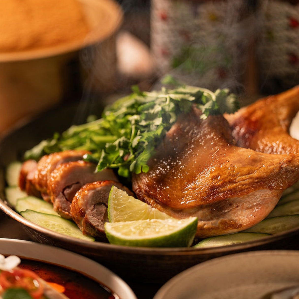 CENSU TOKYOに来店したら欠かせない代表料理”チキンパエリア”。THE CONDER HOUSEのエッセンスとしてタイ料理ガイヤーンの味付けと地元 名古屋のあいち鴨を使用しました。鴨を覆い隠すほどのパクチーで仕上げた一品は、夏の蒸し暑さを吹き飛ばします!CENSUオリジナルの料理ネームを「Duck(鴨)」でサンプリングした遊び心のある一品