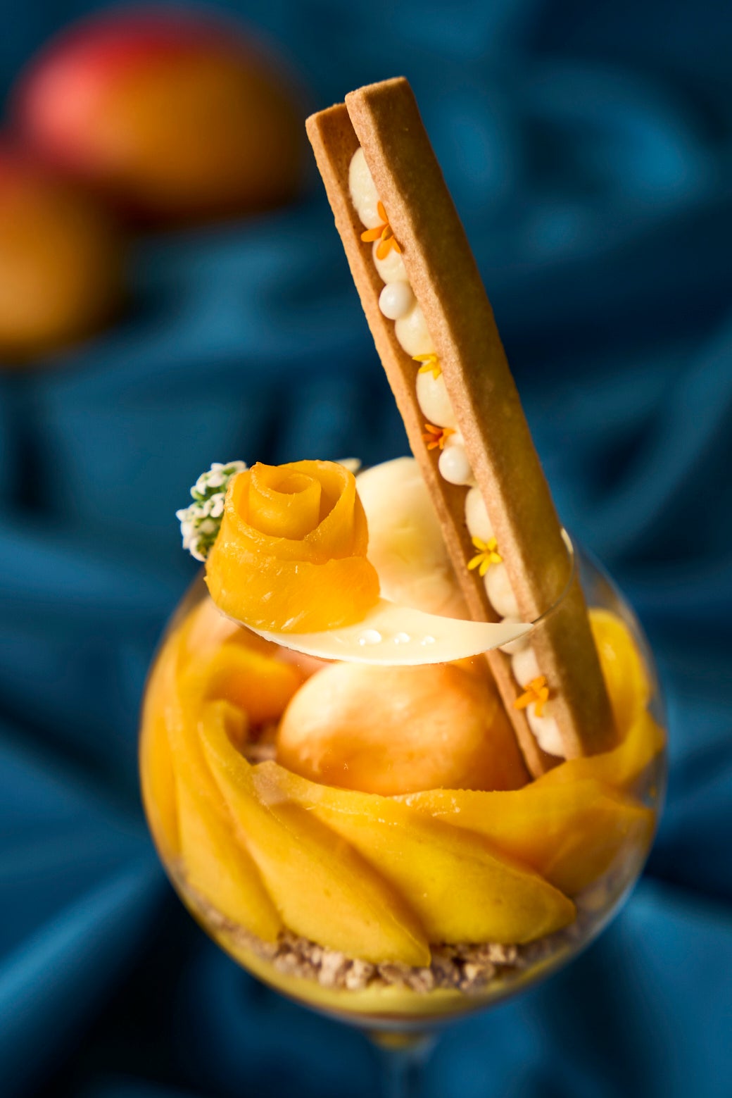 グラスの頂には、マンゴーを薔薇の花のように仕立てたスライスが咲き誇ります。マリーゴールドの花びらをあしらい、バタークリームをはさんだココナッツクッキーが添えられ、南国の風が吹き込むような華やかな表情を演出。注文を受けてからパティシエが一杯ずつ丁寧に組み上げるため、どの角度から見ても美しい仕上がりをお届けします。