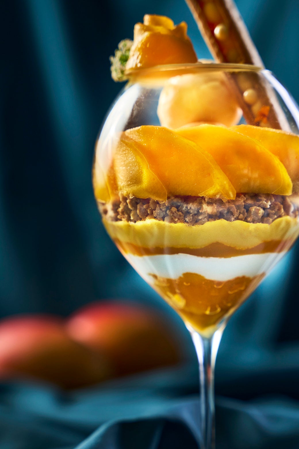 ホワイトチョコクランチのリズムよい食感を抜けると、なめらかなマンゴーのパンナコッタ。コクのある甘みがじんわりと広がります。さらに進むと、マンゴーパッションのソースが鮮やかな酸味を添え、軽やかなココナッツシャンティへ。口の中でふんわりとほどける柔らかさの後、グラスの底に辿り着くのは果肉を丸ごと閉じ込めたジュレ。最後の一口まで、飽きることがありません。