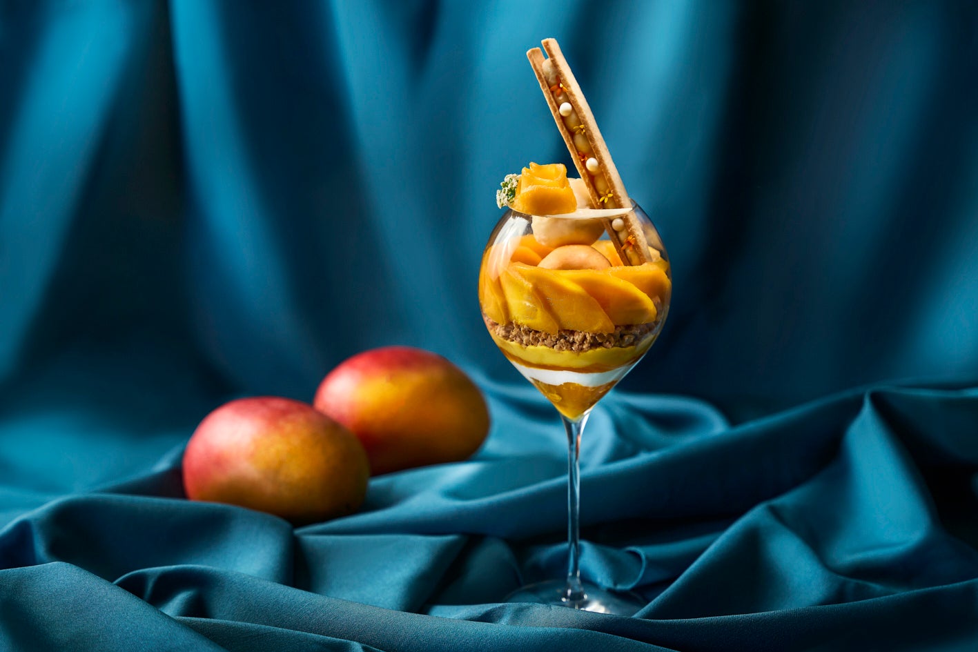 丸みを帯びた優雅なパフェグラスに、完熟マンゴーをふんだんに使った贅沢なパフェをお届けします。ソルベとアイスに始まり、惜しげもなく重ねられた瑞々しいスライス、なめらかなパンナコッタ、ココナッツシャンティ、そして果肉を閉じ込めたジュレへと続く全8層。とろりと甘く芳醇なマンゴーが、食べ進めるごとに異なる顔を見せます。完熟マンゴーが最も輝く、5月だけの特別なパフェです。