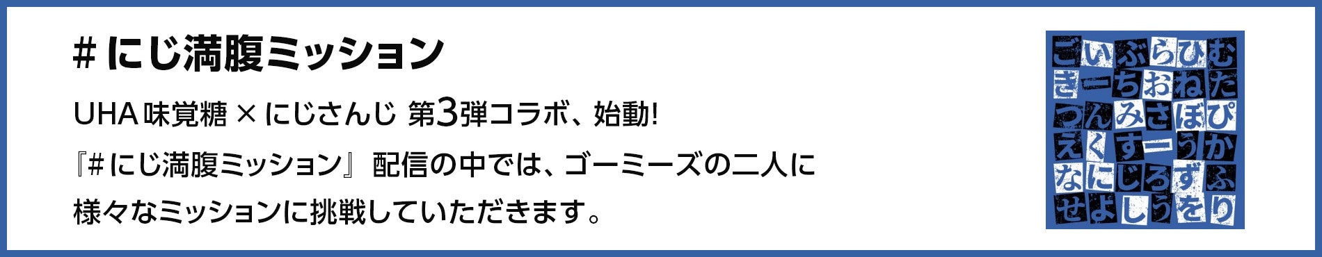 UHA味覚糖株式会社(本社:大阪市中央区、代表取締役:山田泰正)は、ANYCOLOR株式会社(本社︓東京都港区 代表取締役︓田角 陸)が運営するVTuberグループ「にじさんじ」に所属する「ゴーミーズ(GOOOMiiES)」と、新感覚のごはん系バー「満腹バーシリーズ」とのコラボライブ配信「#にじ満腹ミッション」を開催します。昨年実施した「SMC(すめし)組」とのコラボ配信では、SNS上で「#にじ満腹バー」がトレンド入りし、多数の投稿が寄せられるなど大盛況となったのを受け、今回の配信企画が決定しました。