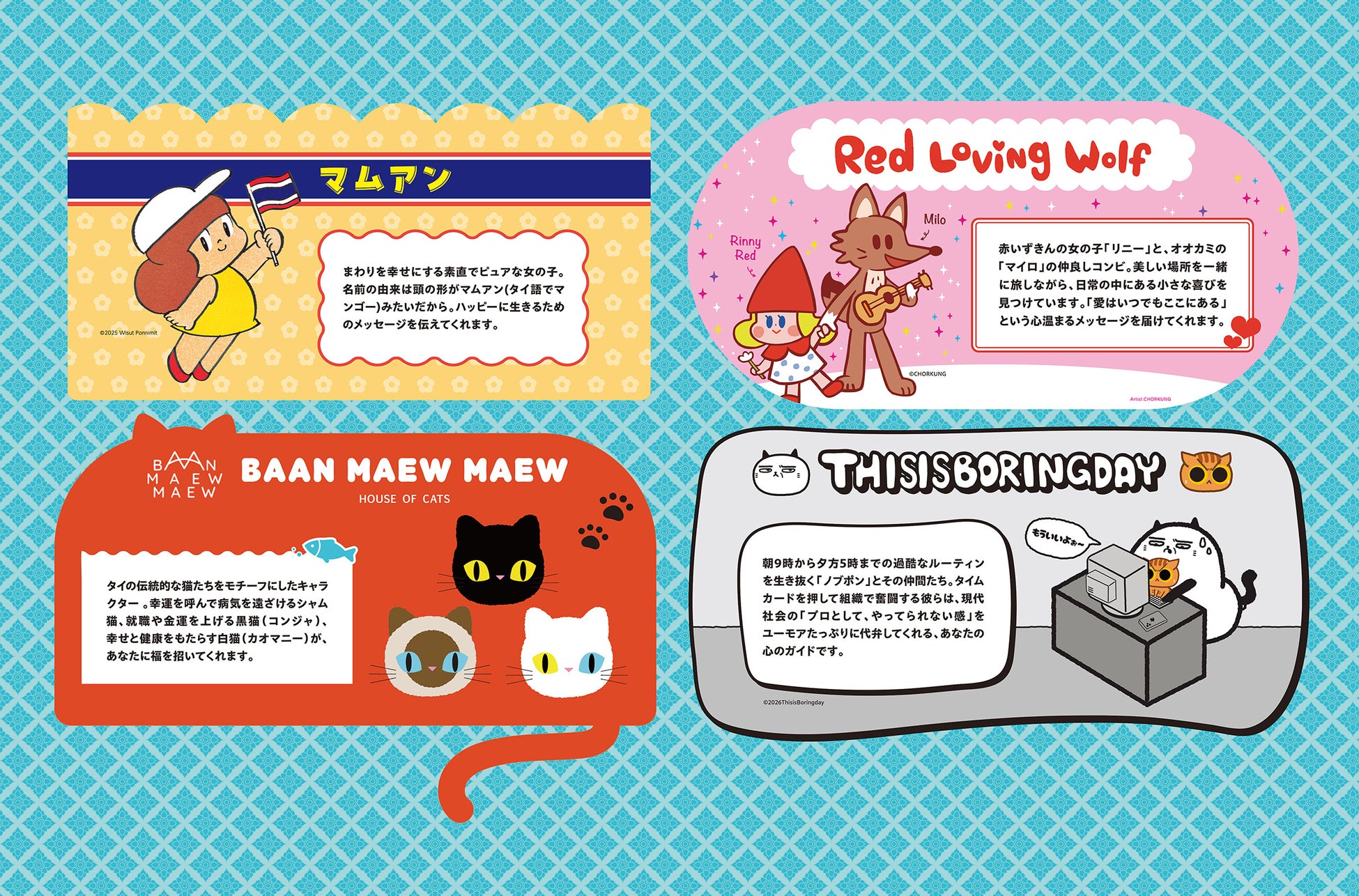 まわりを幸せにする素直でピュアな女の子。名前の由来は頭の形がマムアン(タイ語でマンゴー)みたいだから。ハッピーに生きるためのメッセージを伝えてくれます。