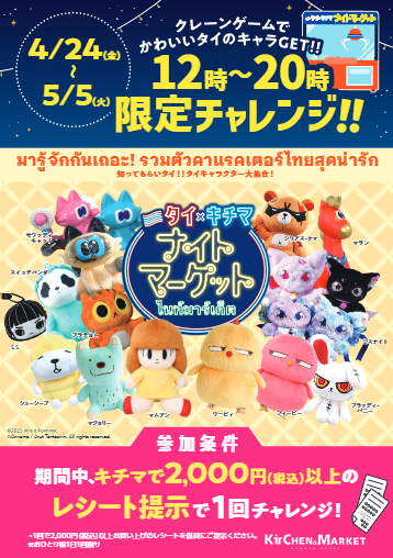 期間中、キチマで2,000円(税込)以上のレシート提示で1回クレーンゲームにチャレンジ。